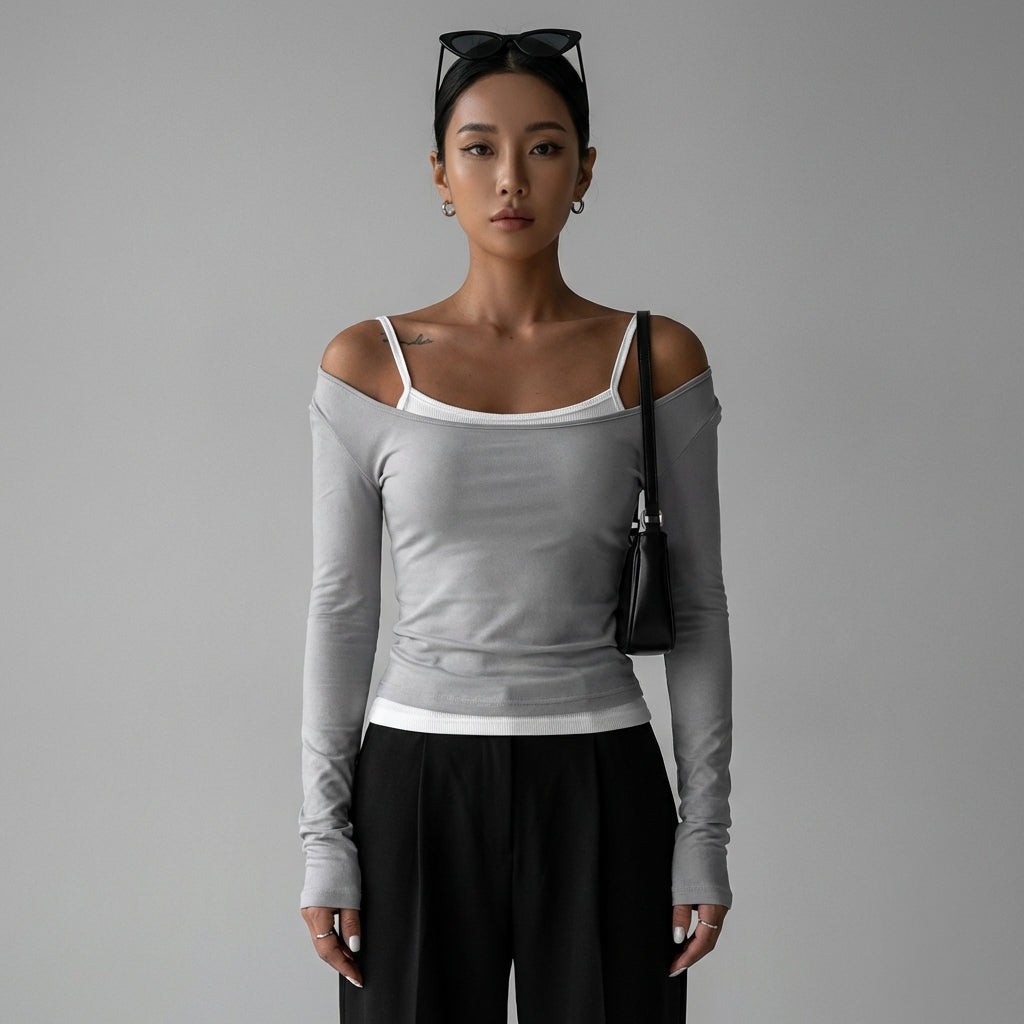Embrace a trendy and bold look with our slim two-piece set, featuring an off-the-shoulder top and a long-sleeved t-shirt. Perfect for a modern and casual silhouette! ✨