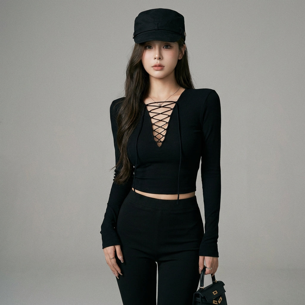 Assert your style with our black crop top, featuring a flattering V-neckline and long sleeves for a modern and elegant look. Its fitted cut enhances the silhouette, perfect for a bold and trendy look! 🖤