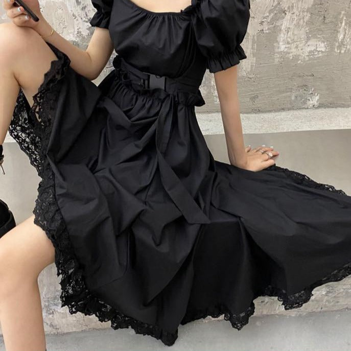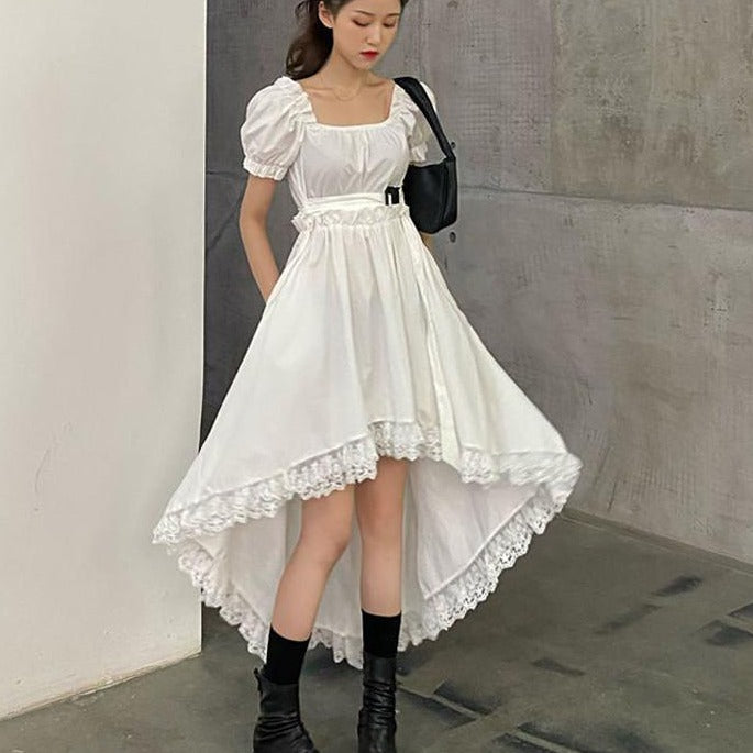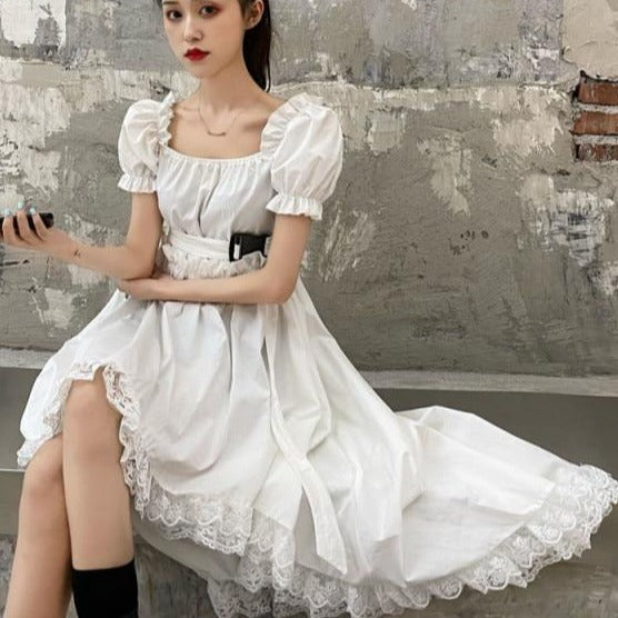 Discover our Street Wear dress, highly popular among young girls in South Korea. It is made from a lightweight fabric with puffed sleeves and embroidery. This dress ties at the waist to give you a slender silhouette.