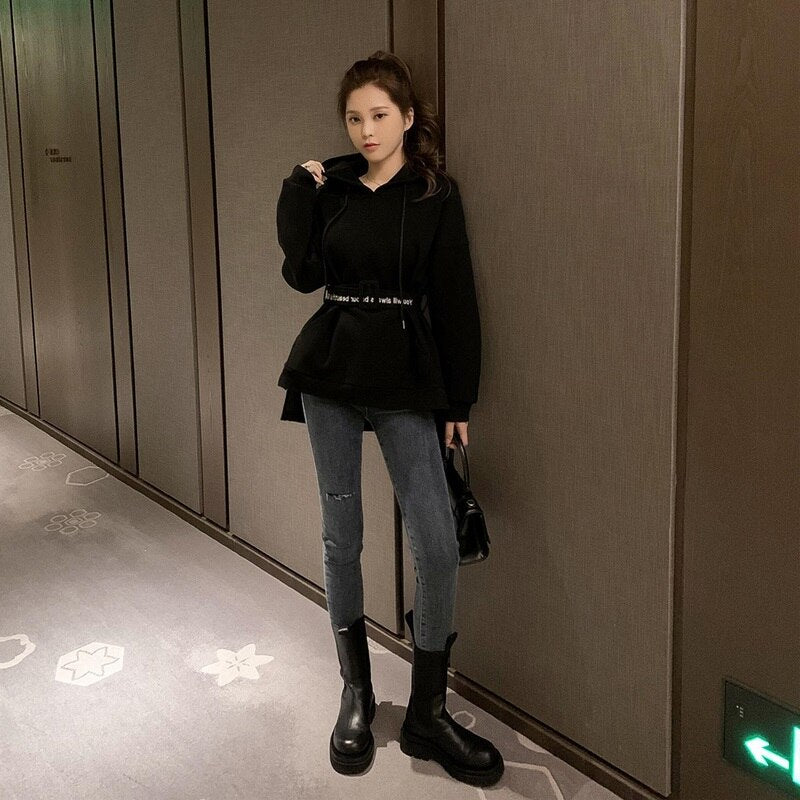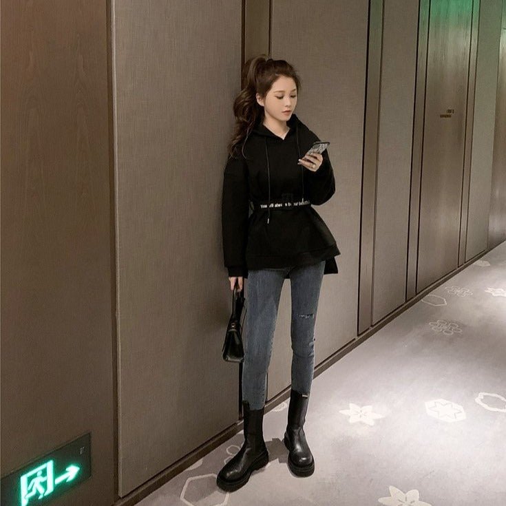 Wear this long Korean hoodie if you like hoods, drawstrings, and the dress effect. This very long hoodie gives a dressed-up effect that is highly appreciated in Seoul. Wear this hoodie as a dress or as a full top, depending on your mood.