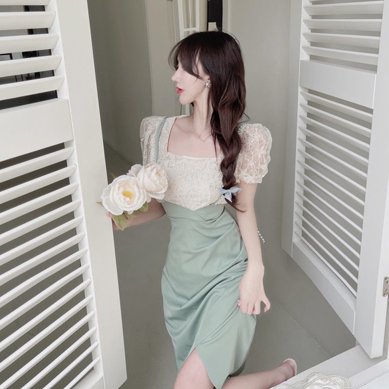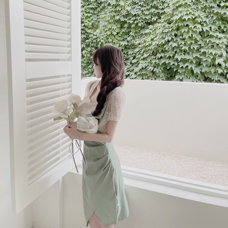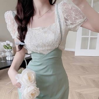 This outfit consists of an embroidered top and a skirt with long suspenders. It's a perfect set for summer in South Korea. The freshness of this vintage design is ideal for feminine women.