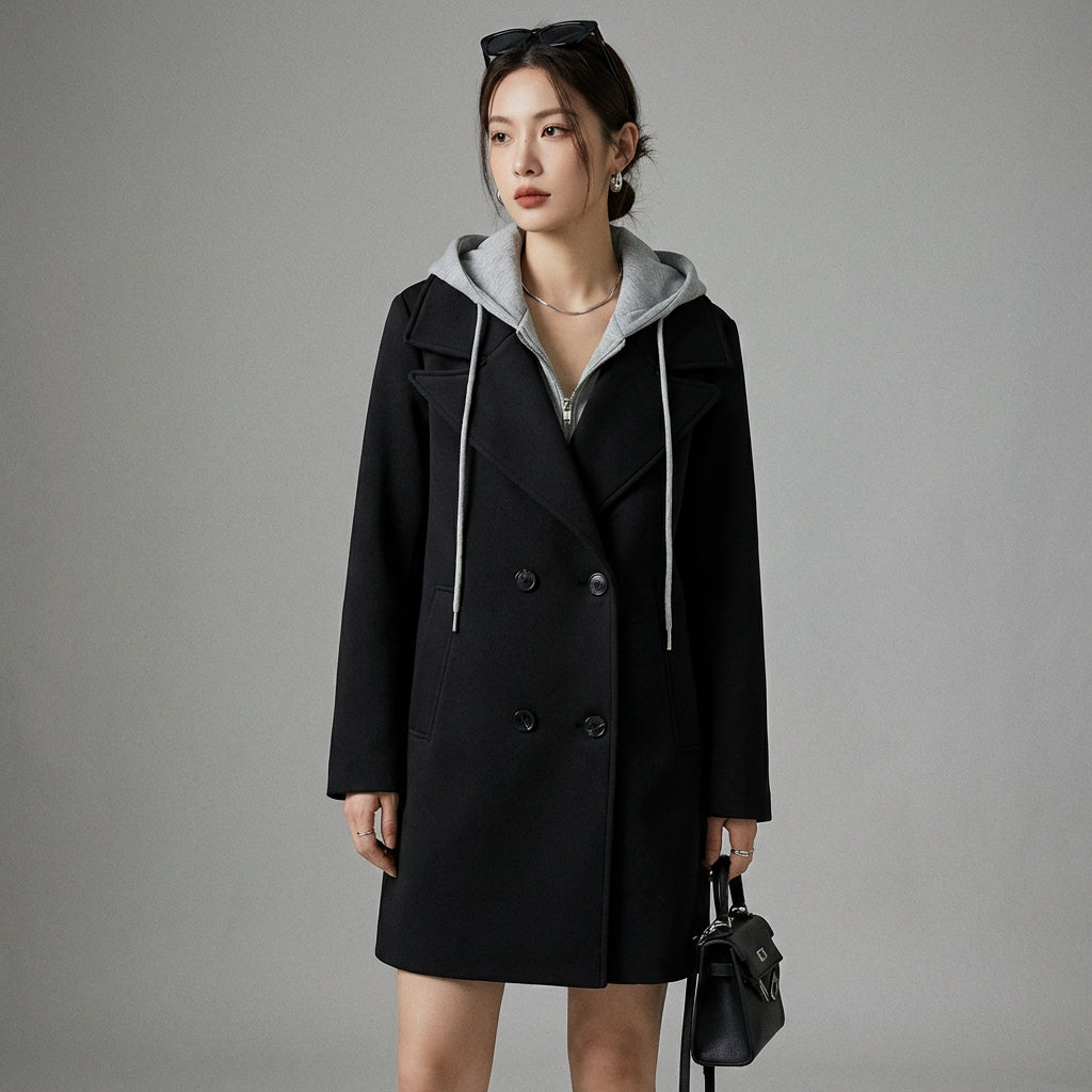 Manteau oversize noir à double boutonnage et capuche détachable - Mode coréenne
