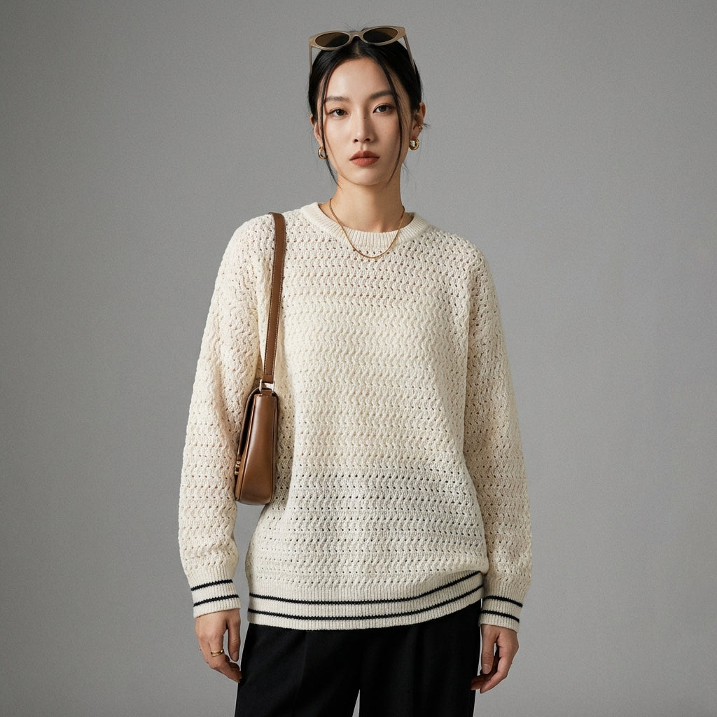 Embrace a casual yet sophisticated look with our round-neck knitted sweater. Its openwork design adds a touch of originality, perfect for an elegant and comfortable style in any season! ✨