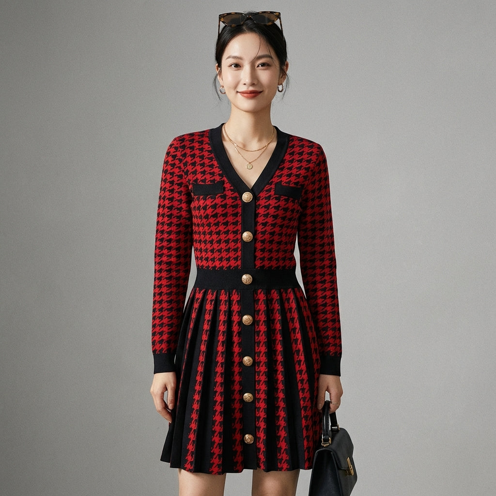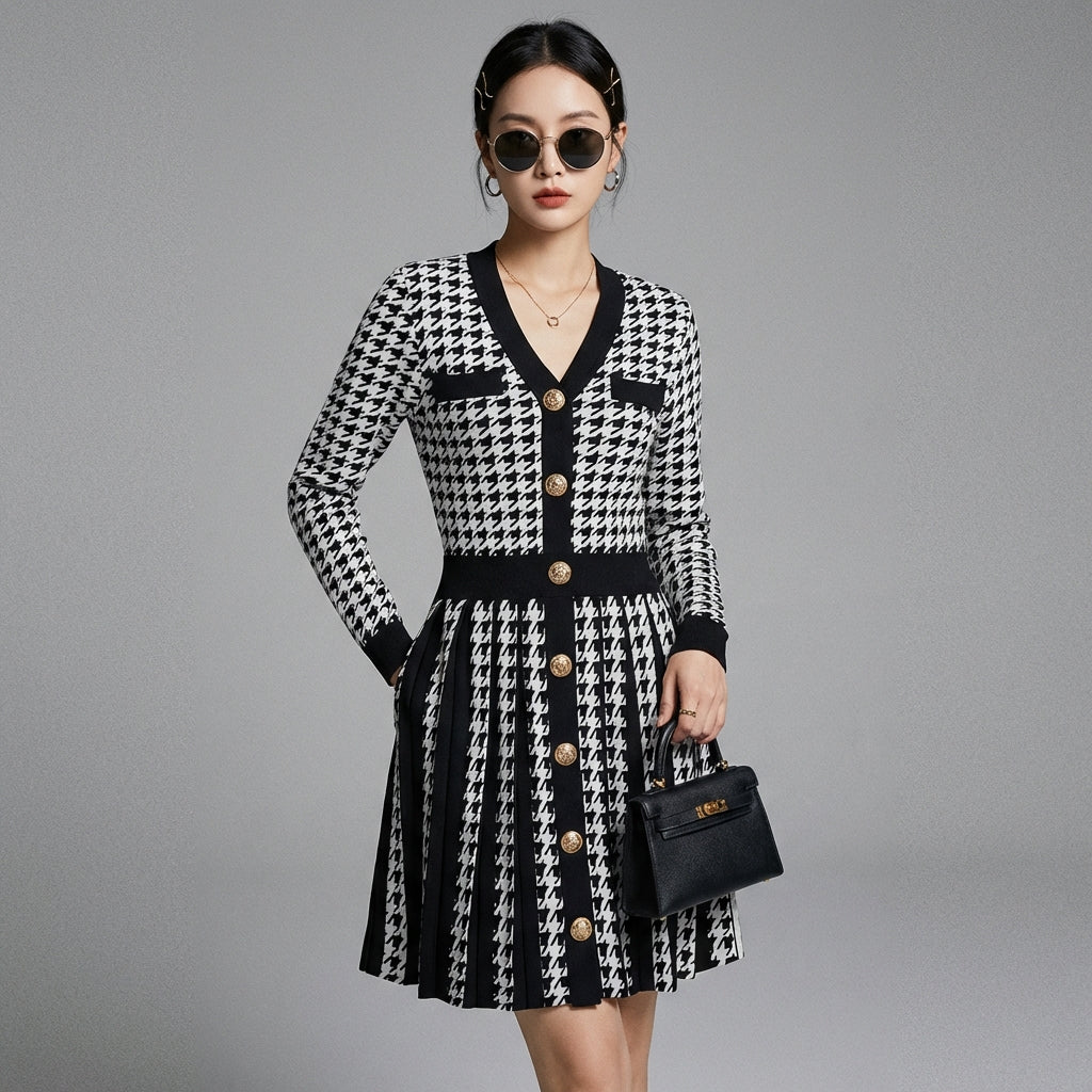 Embrace a chic and timeless look with our V-neck pleated dress. Its classic houndstooth pattern and flattering A-line cut enhance the silhouette. Ideal for refined elegance in any season! ✨