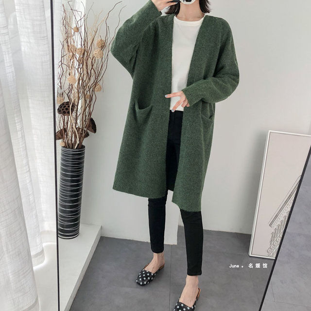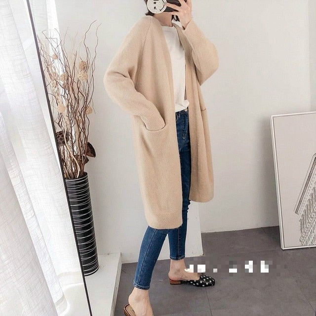 This Korean long jacket has a soft, cardigan-like material. It is ideal for staying warm and comfortable in all circumstances. It's a long jacket that can be worn well indoors and outdoors. It is available in several colors.