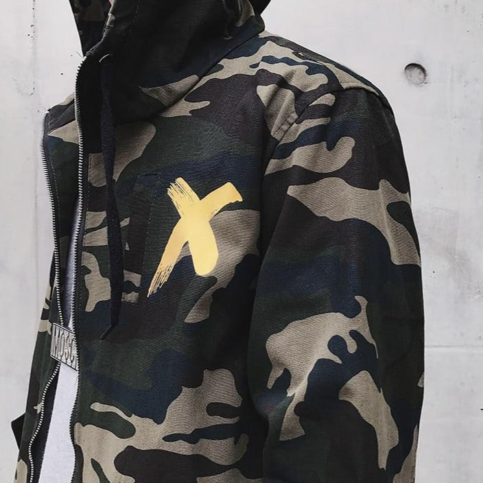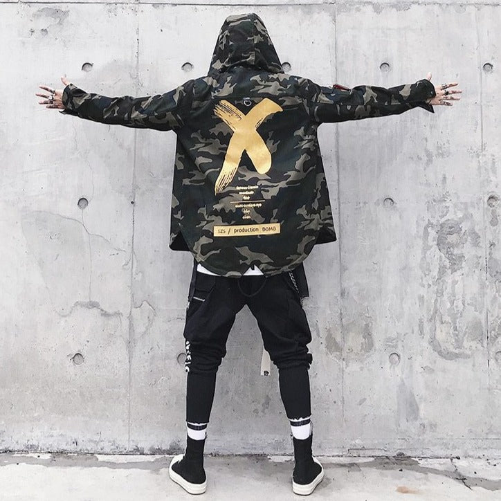 The X camouflage coat is a military-style model.