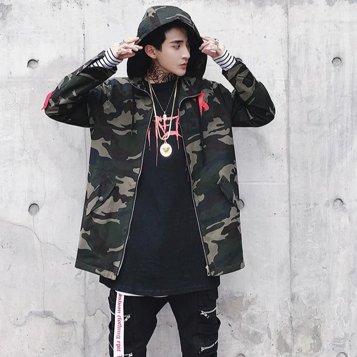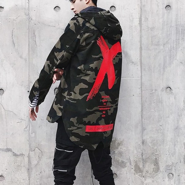 Young Koreans must go through military service. Fashion has transformed the camouflage pattern to create a beautiful streetwear coat. This Korean coat features a large X on the back. It's a trendy hooded coat among young people.