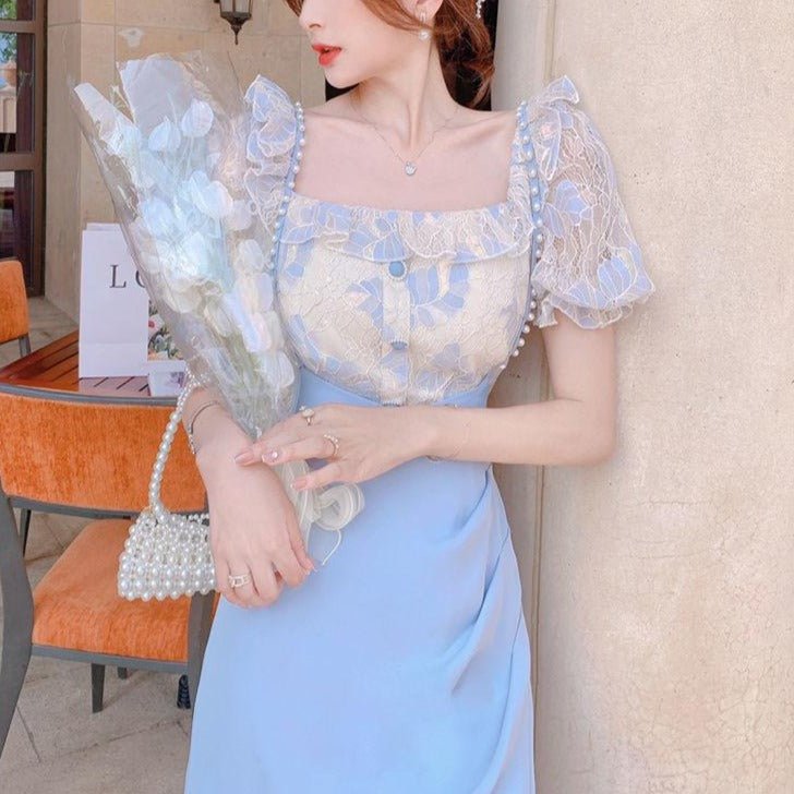 This bluish set has a Korean look. It is composed of a vintage puff-sleeved top and a low-cut dress with a blue flower design. It's a beautiful set for summer. The straps are made with pearls and there is embroidery.