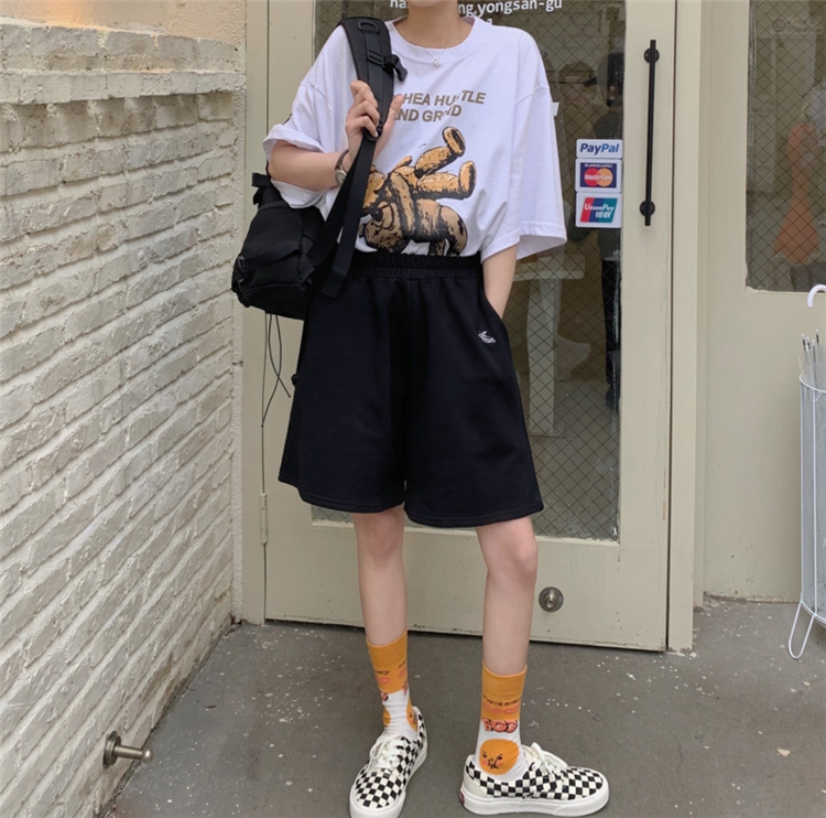 These jogging material shorts are available in several colors and with several patterns. They are ideal shorts for sports. They can be worn high-waisted or mid-waisted. One model is plain, another features a moon, and the last one has a signature.