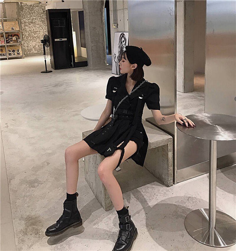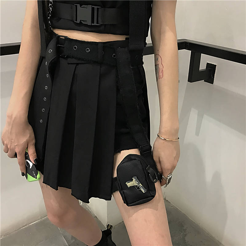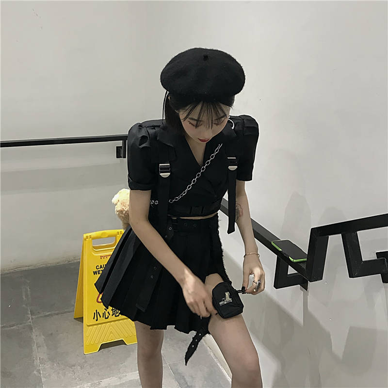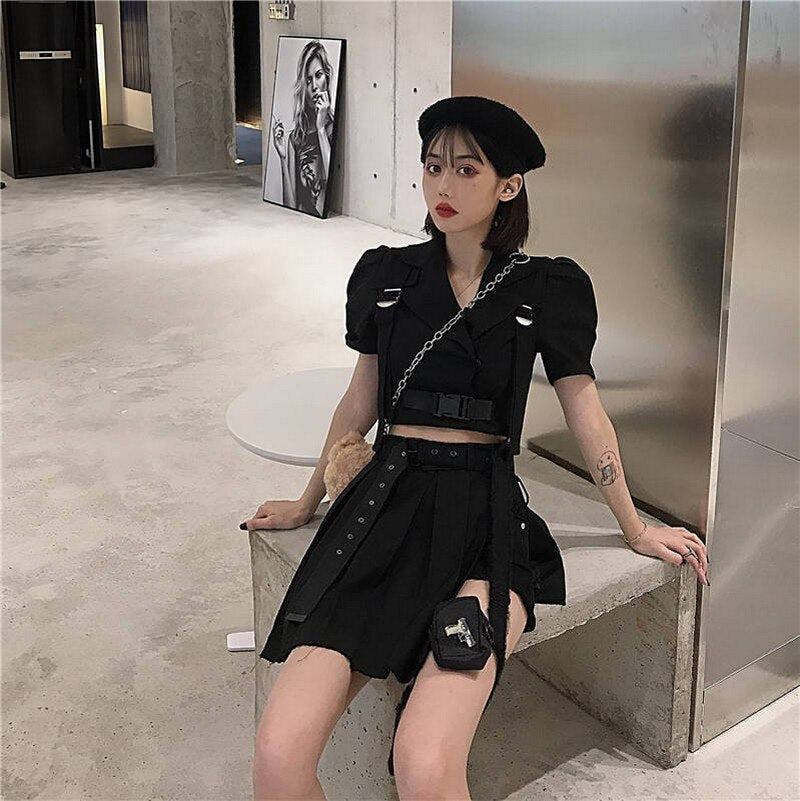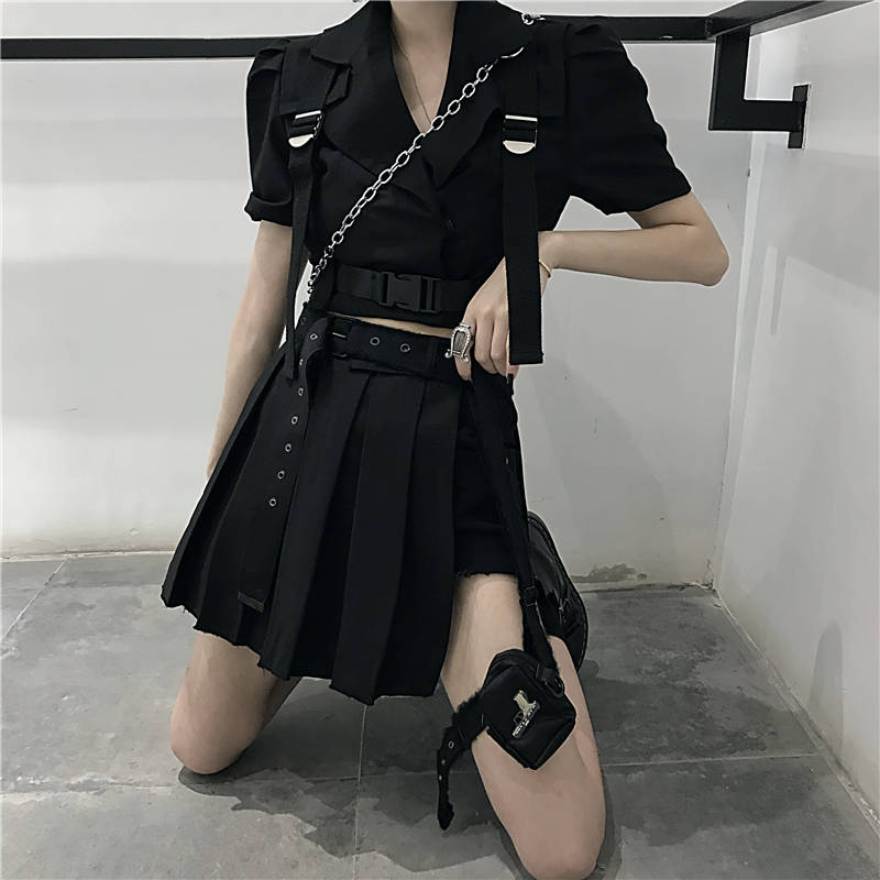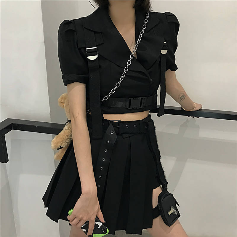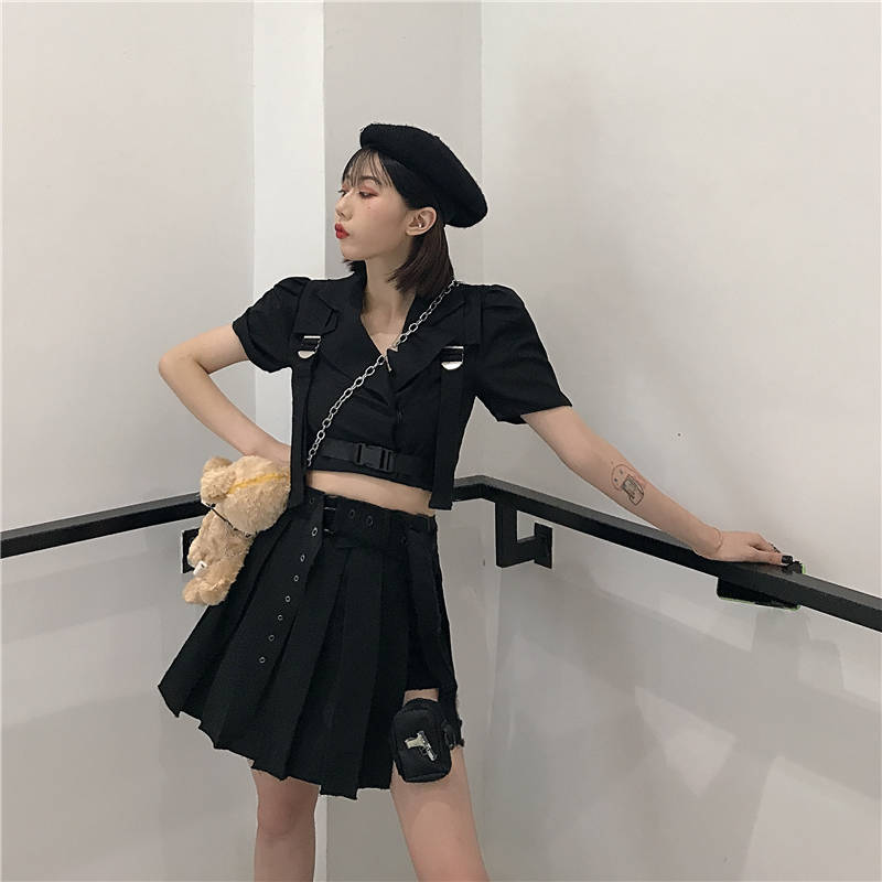 This set is composed of a black Korean skirt and shirt. The fabric is comfortable and the accessories give a truly streetwear style.