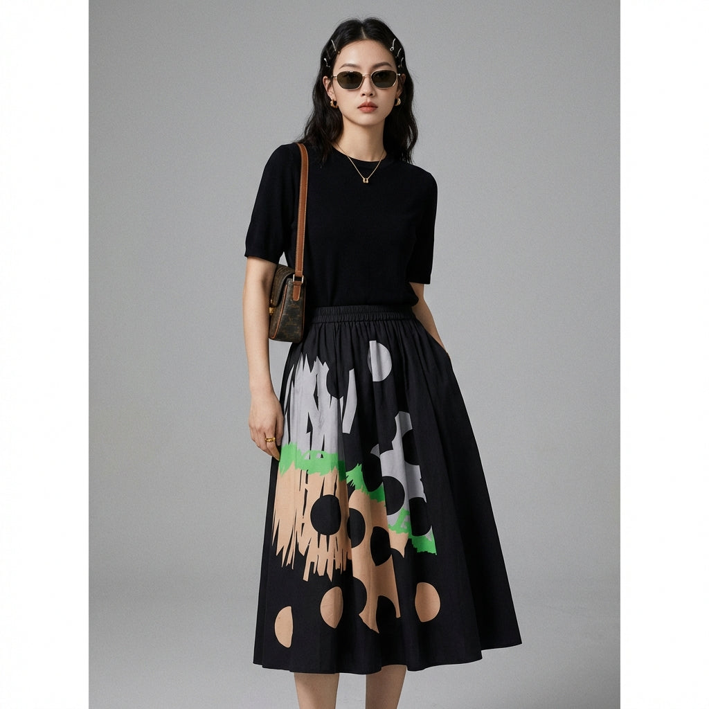 - Type: Long skirt, A-line cut, Elastic waist. A fluid silhouette and an adjustable waist for optimal comfort and adaptability to different body types.