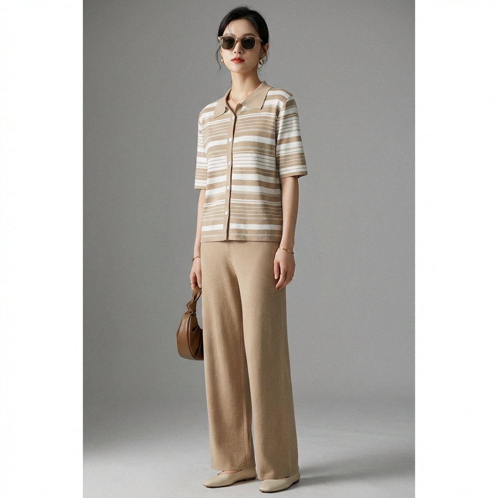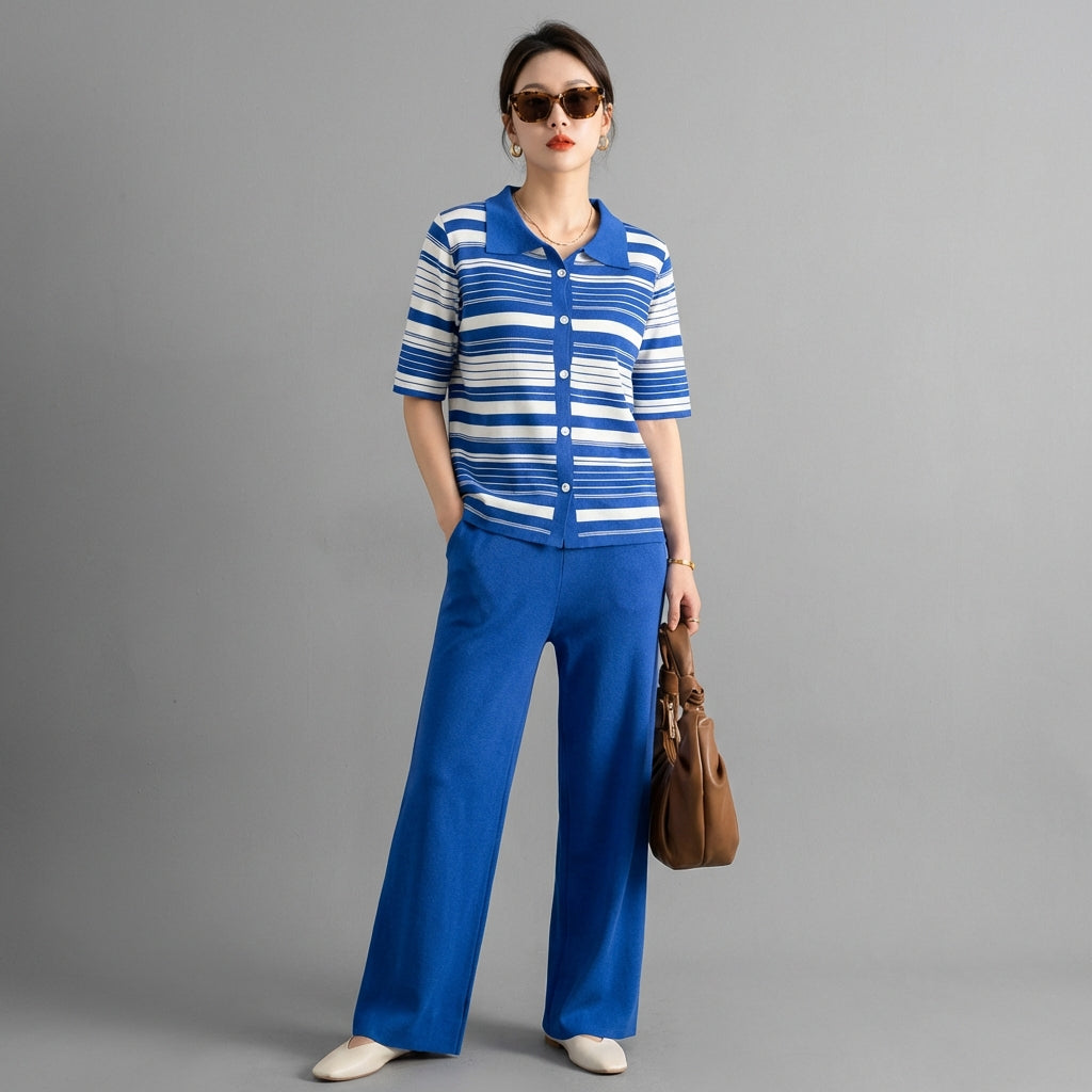 Ensemble rayé décontracté femme - Koreanxwear. Haut et pantalon longs. Mode K-fashion estivale.
