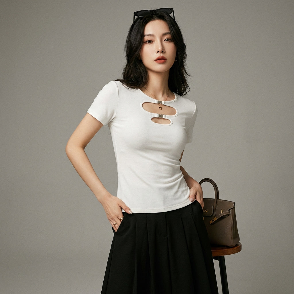 Assert your style with our cut-out cropped t-shirt, a must-have for a bold and trendy look. Its openwork design adds a touch of discreet sensuality, perfect for sunny days or summer evenings! ✨