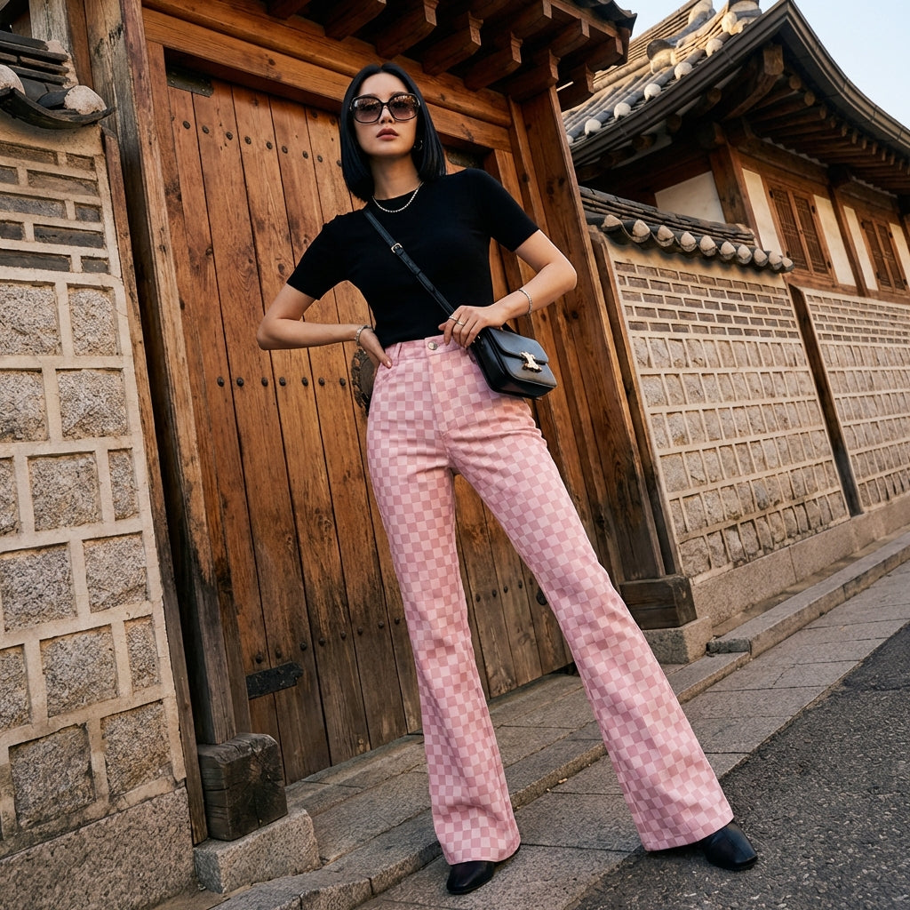 Assert your style with our high-waisted flared trousers, a trendy piece with a pink checkered pattern that will lengthen your silhouette. Perfect for a casual and chic look inspired by Korean fashion! 💖