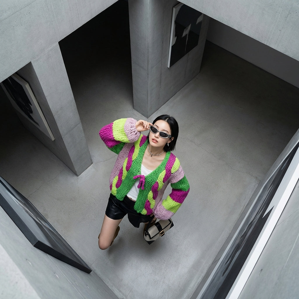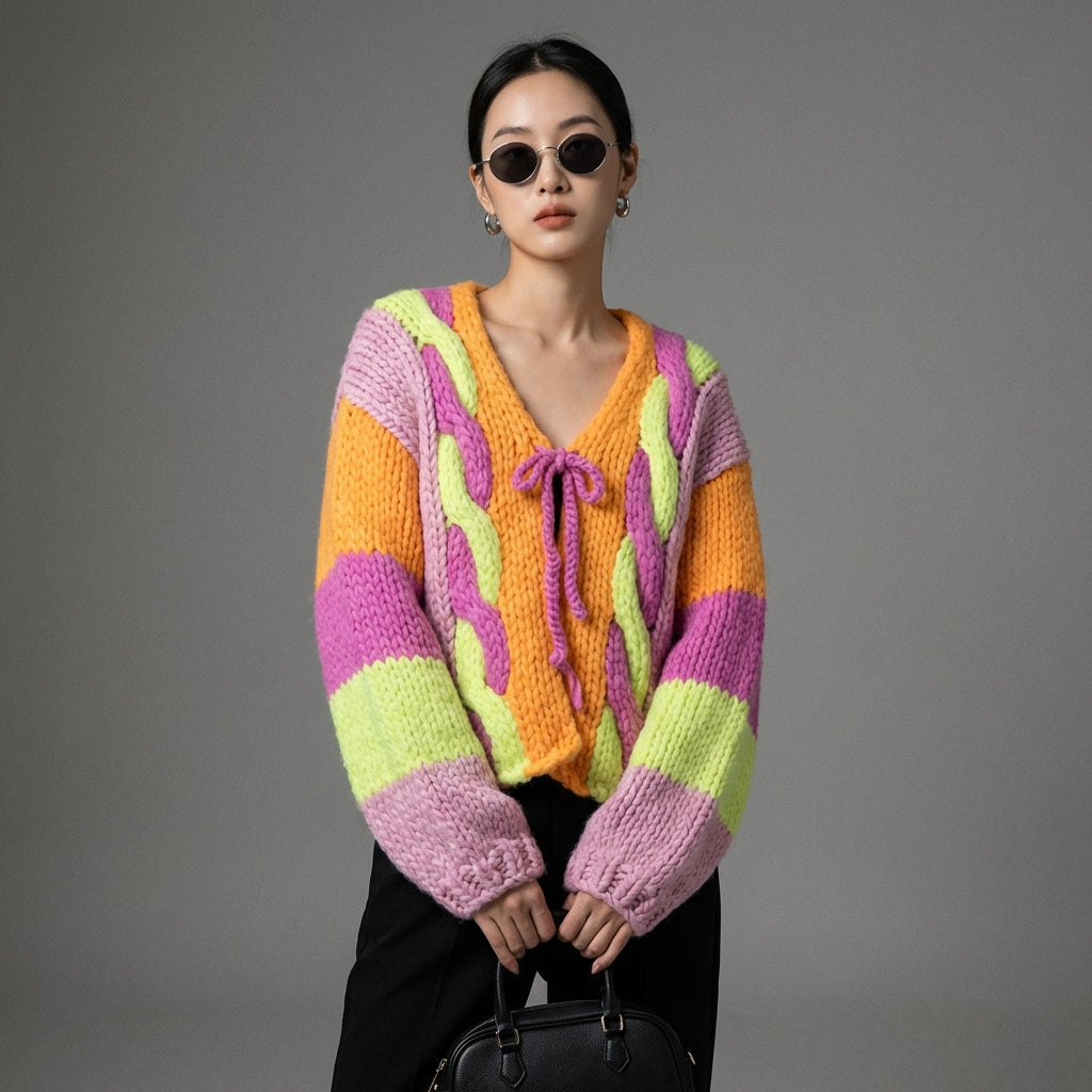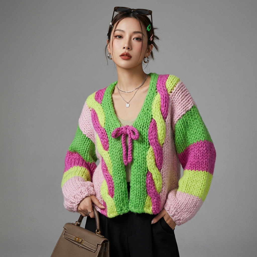 Cardigan tricoté col V ample rose et vert - Mode K-fashion
