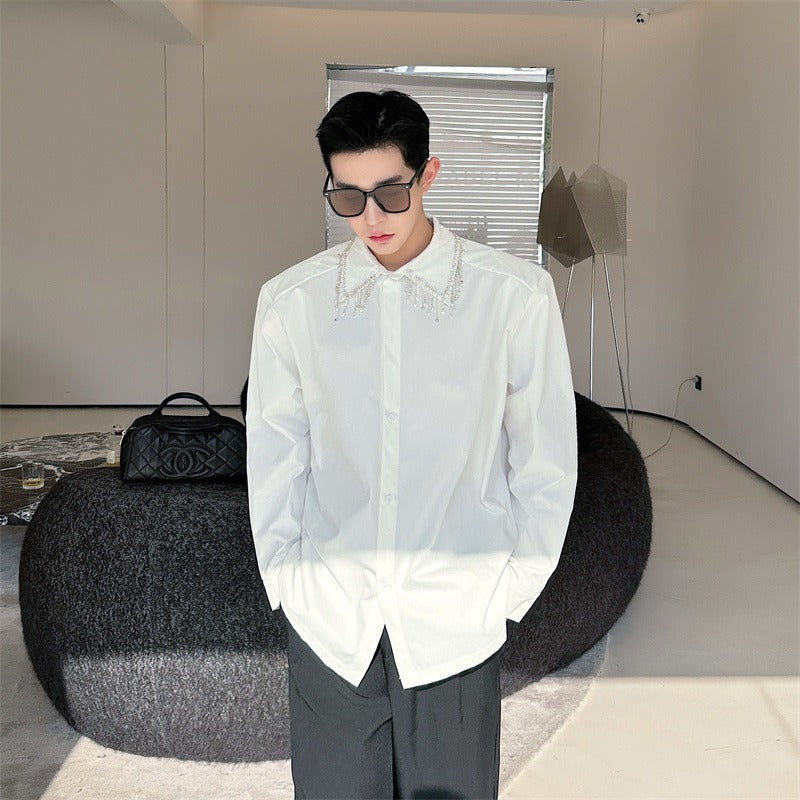 Adopta un look elegante y sofisticado con nuestra camisa decorativa de cadena de diamantes para mujeres. Esta pieza única se distingue por sus detalles metálicos y su cuello con solapa, perfecta para un estilo chic y casual. 🌟