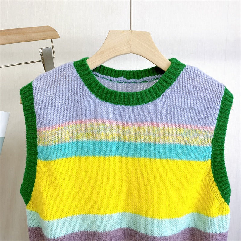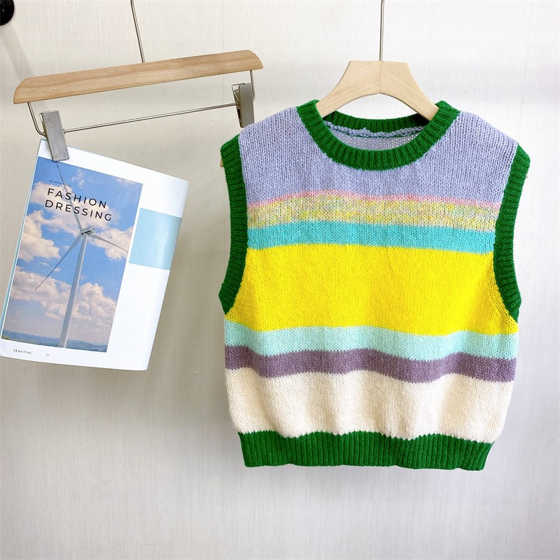 Adopta un look casual y con estilo con nuestro chaleco de punto sin mangas, perfecto para una superposición elegante. Su diseño de bloques de color y sus rayas añaden un toque único a tu atuendo. 🌟