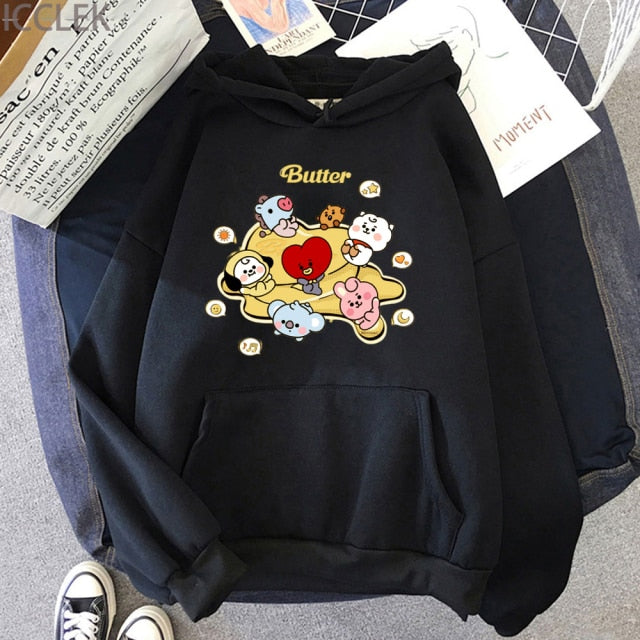 Si te encanta el universo coreano de BTS, esta es la sudadera perfecta para ti. Representa el álbum Butter del grupo de K-pop y los personajes animados de BT21. Esta sudadera es cómoda, ya que está hecha de algodón y poliéster.
