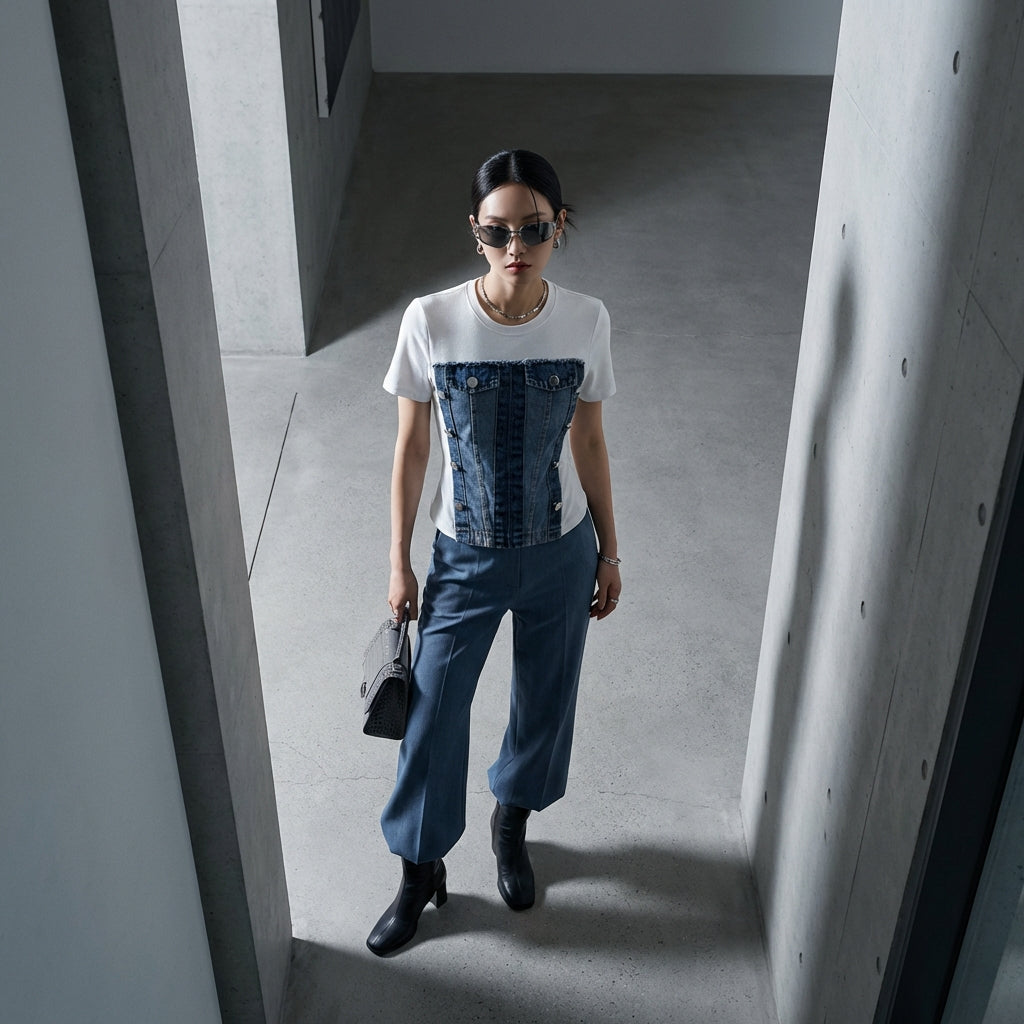 Adopta un look moderno y casual con nuestra camiseta de efecto dos piezas de mezclilla. Su corte ajustado y su ingenioso diseño crean una silueta moderna y elegante, ¡perfecta para todas tus salidas veraniegas! ☀️