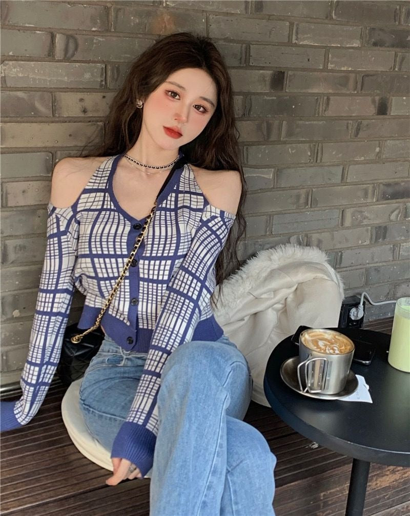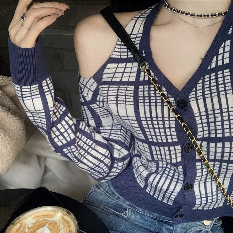 Realza tu gusto por la moda con este suéter de cuadros de manga larga para mujer, que combina un estilo minimalista con un elegante diseño de hombros descubiertos y cuello en V. Esta prenda combina funcionalidad y estilo, ideal para tu guardarropa de otoño. 🍁