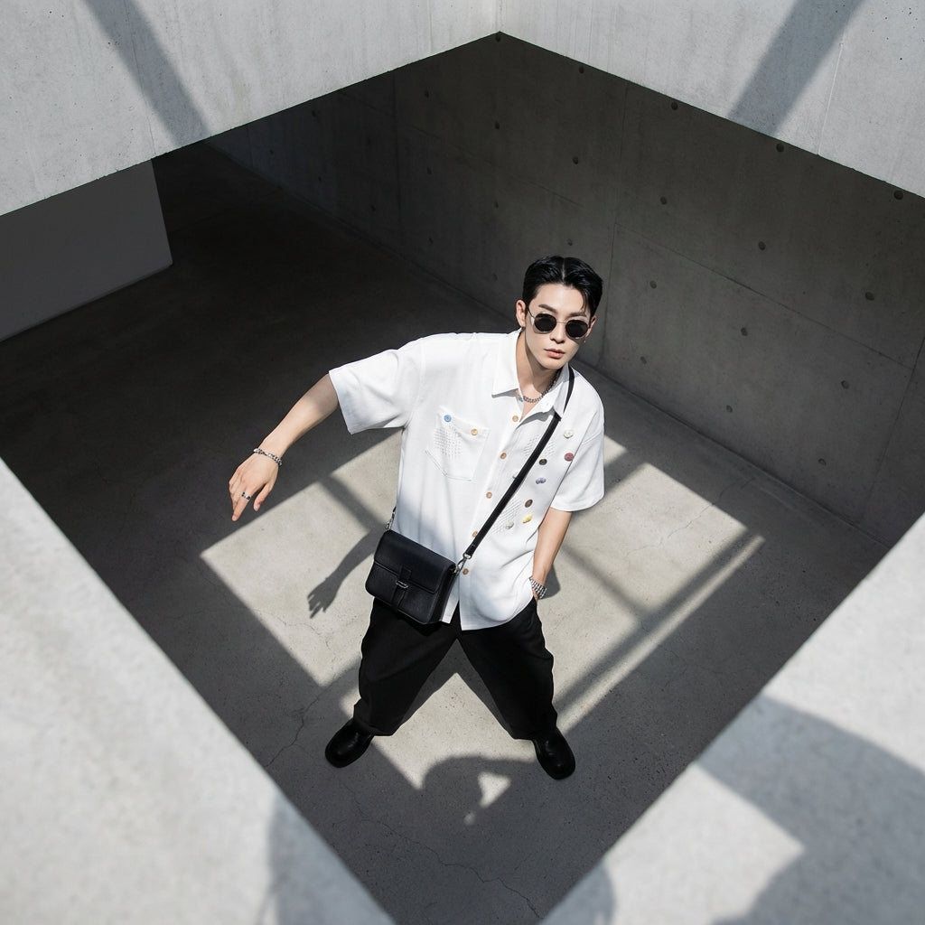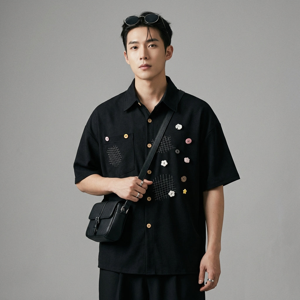 - Estilo: Streetwear, K-fashion, Casual. Esta camisa encarna el espíritu libre y moderno de la moda coreana, perfecta para un look urbano y relajado.