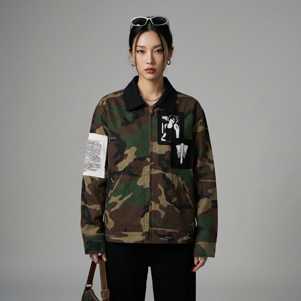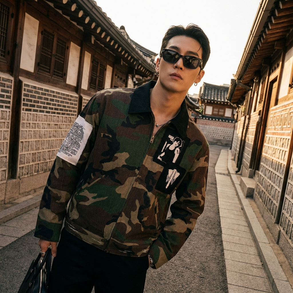Elige esta chaqueta vaquera de camuflaje para añadir un toque de originalidad y carácter a tu armario, manteniéndote a la vanguardia de las tendencias coreanas.