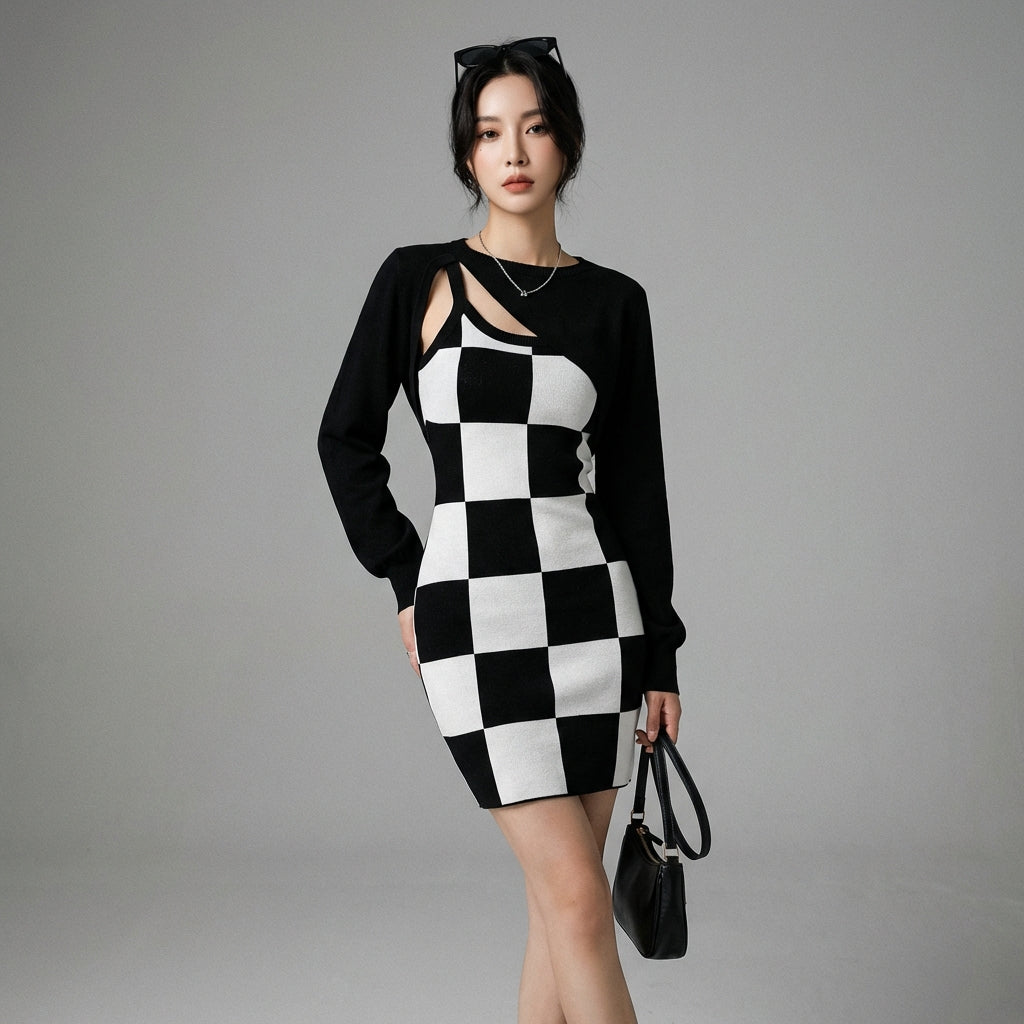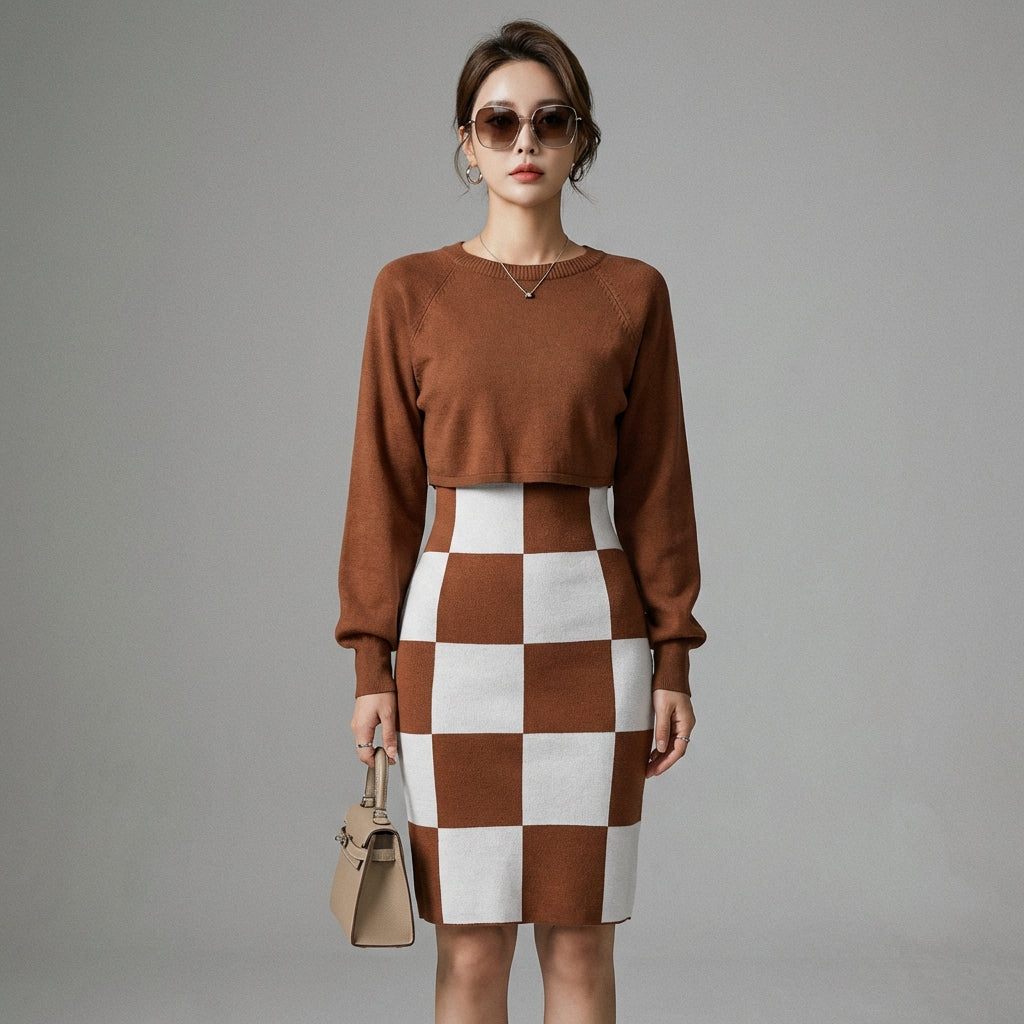 Descubre nuestro elegante conjunto compuesto por una falda larga a cuadros y una blusa de punto de manga larga. ¡Este elegante dúo encarna el estilo retro con un toque moderno, perfecto para quienes buscan un look sofisticado y cómodo! ✨