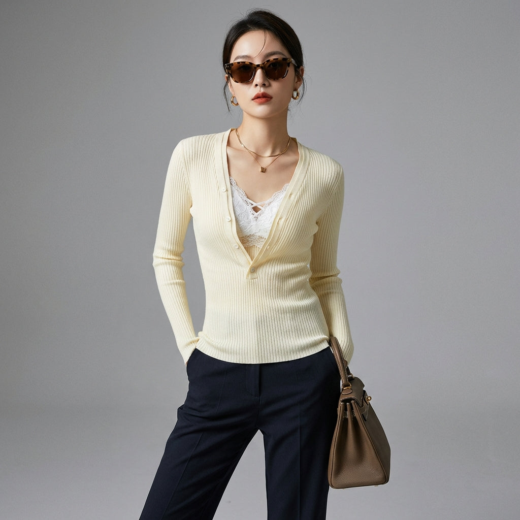 - Estilo: Business chic, Minimalista, K-fashion. Este jersey encarna la elegancia moderna y la simplicidad refinada, perfecta para un entorno profesional o una salida informal.