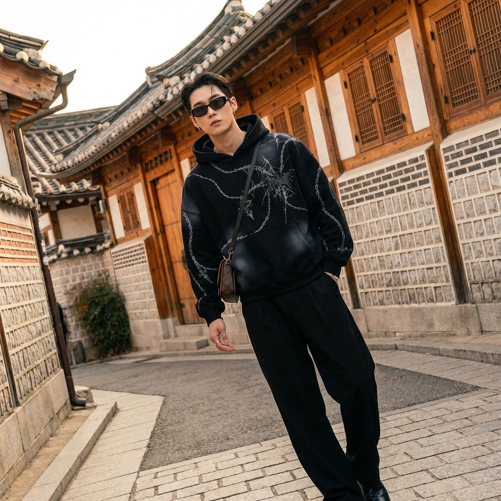 - Estilo: Streetwear, K-fashion, Urbano, Grunge. Esta sudadera encarna el espíritu rebelde y moderno de la moda coreana, perfecta para expresar tu individualidad.