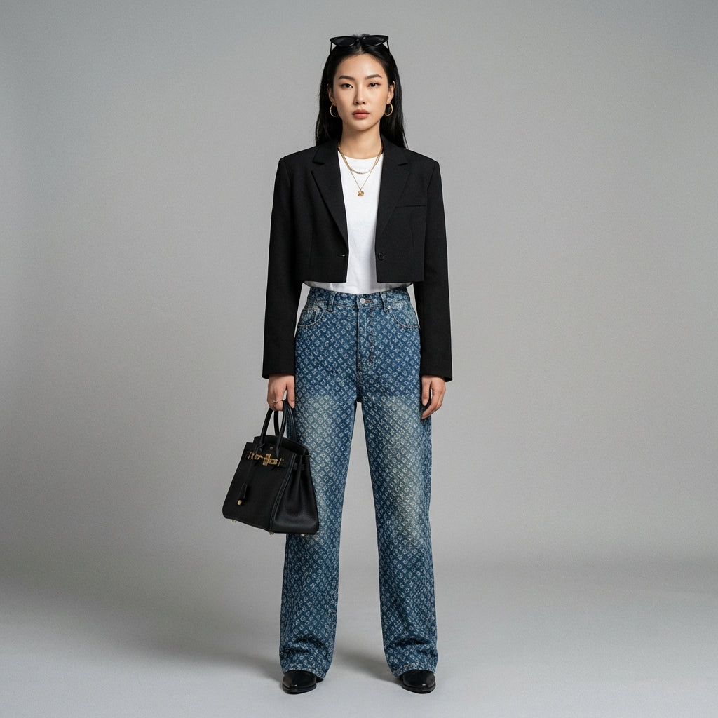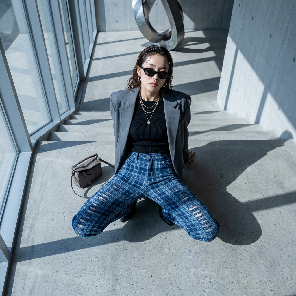 - Tipo: Vaqueros de talle alto, corte holgado, detalles con aberturas. Una silueta relajada que combina comodidad y originalidad, con un toque de modernidad.