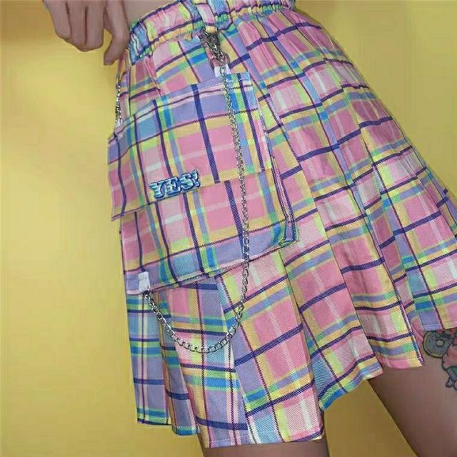 Si te gusta bailar y buscas una falda colorida, esta falda Yes es ideal para ti. Es una falda rosa, azul y amarilla con un tejido agradable y una cadena. Es perfecta para hacer coreografías o tener un estilo rock coreano.