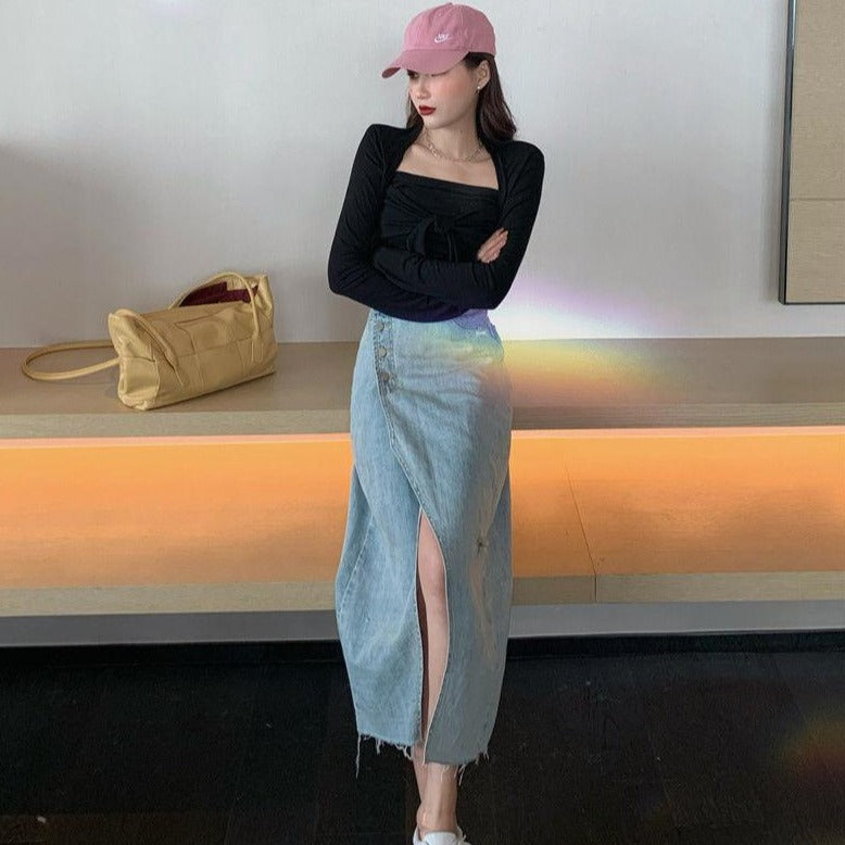 ¿Te encanta el tejido vaquero? ¿Quieres una falda informal? Esta falda inspirada en la moda vintage es ideal para ti. Está confeccionada con un resistente tejido vaquero y tiene una abertura en la parte delantera. Su color desgastado le da un estilo único.