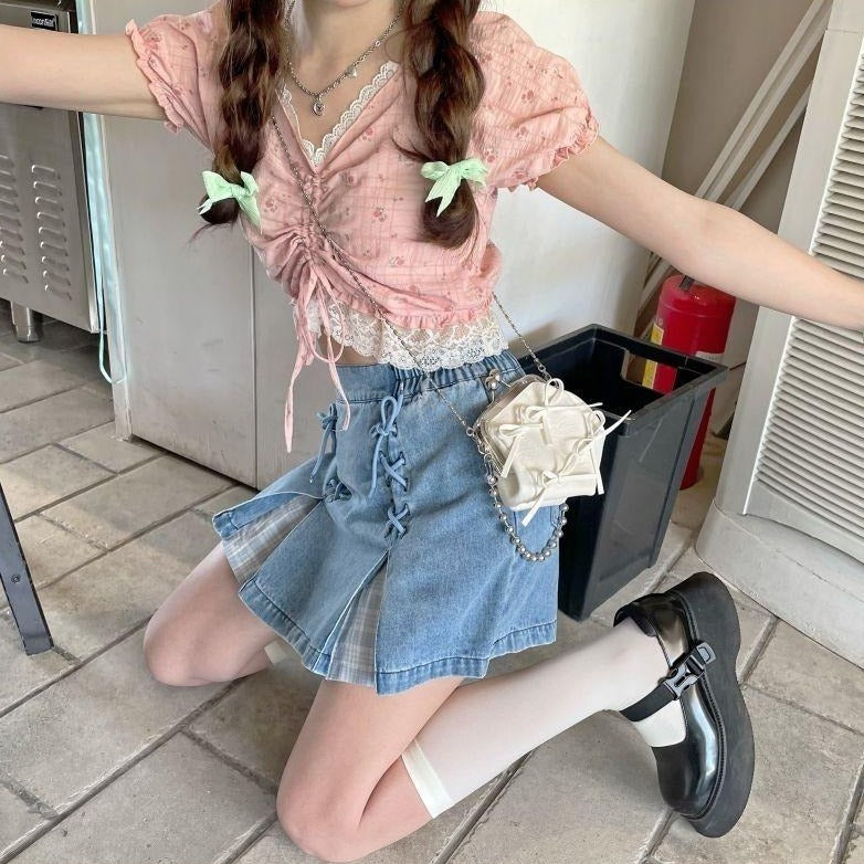 ¿Necesitas una falda bonita y a la moda? ¿Quieres un estampado a cuadros? Esta falda vaquera es perfecta para ti. Tiene un tejido de cuadros escoceses y bonitos cordones. Es una falda coreana muy apreciada por las jóvenes.