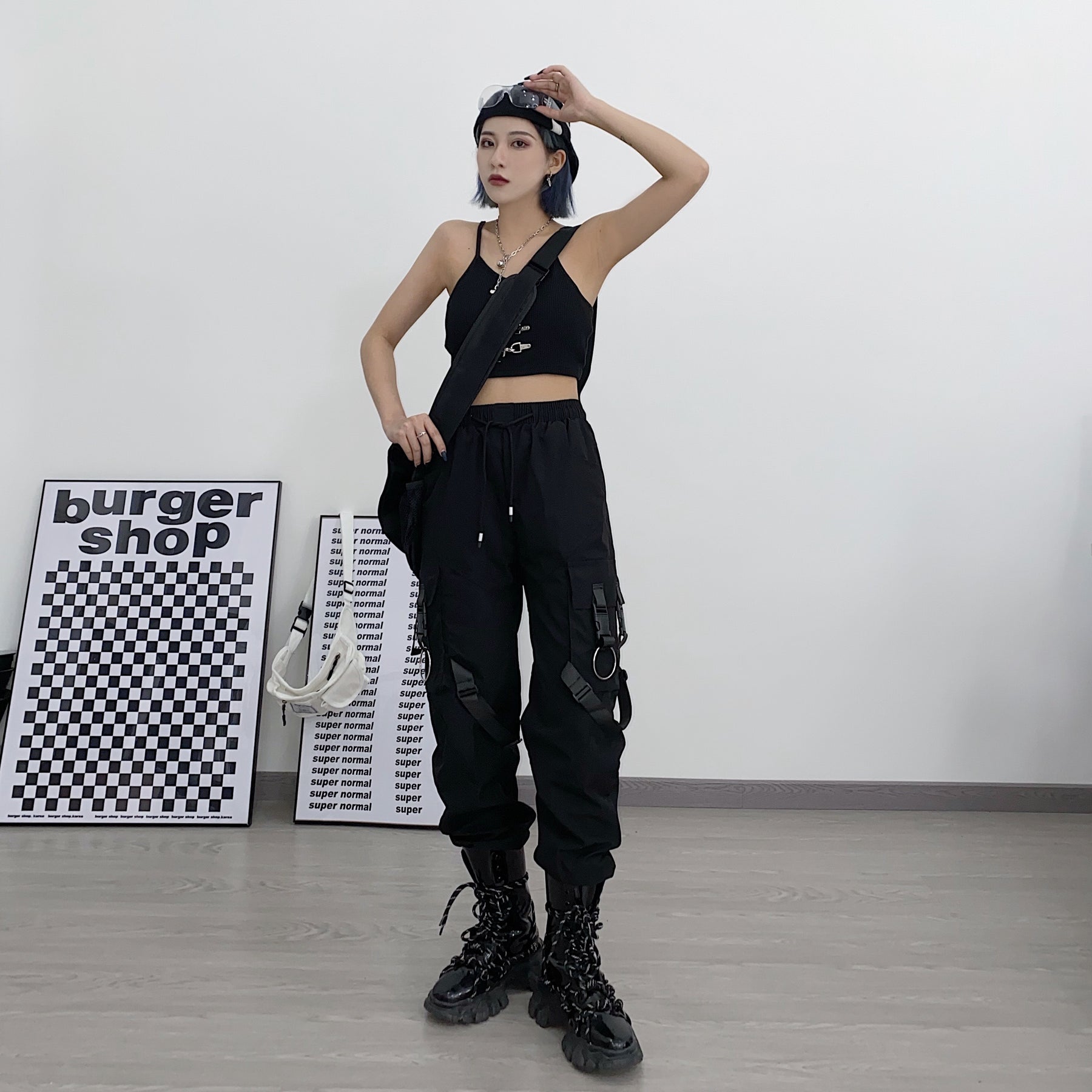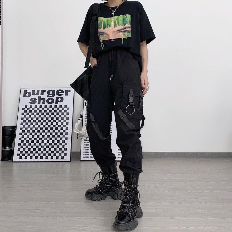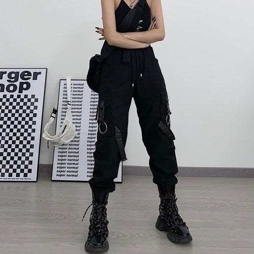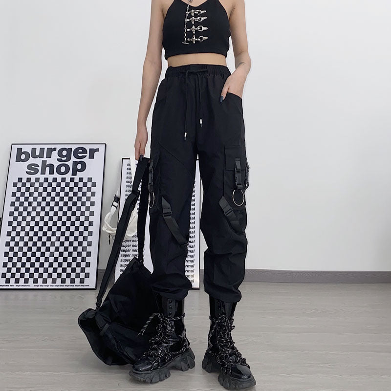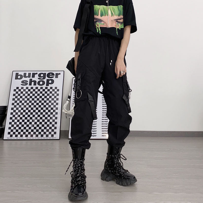 ¿Buscas unos pantalones con partes desmontables? Aquí tienes los pantalones de streetwear con clips. Estos clips de plástico le dan un estilo a tu atuendo. Es el estilo futurista coreano que está gustando mucho ahora mismo. Estos pantalones son de color negro.