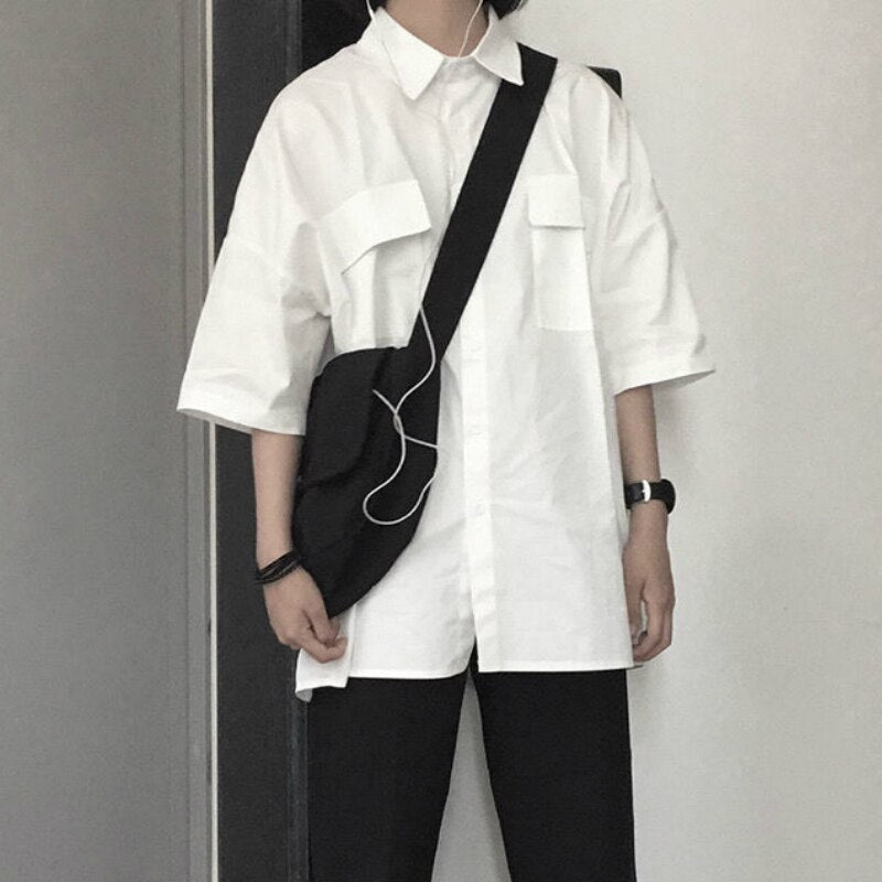 ¿Tienes ganas de llevar una camisa holgada con mangas cortas? Aquí tienes este popular modelo coreano con mangas de largo medio. Esta camisa blanca es ideal para los atuendos streetwear de Seúl.