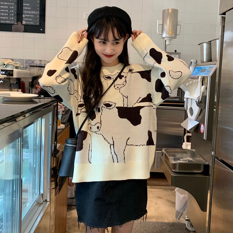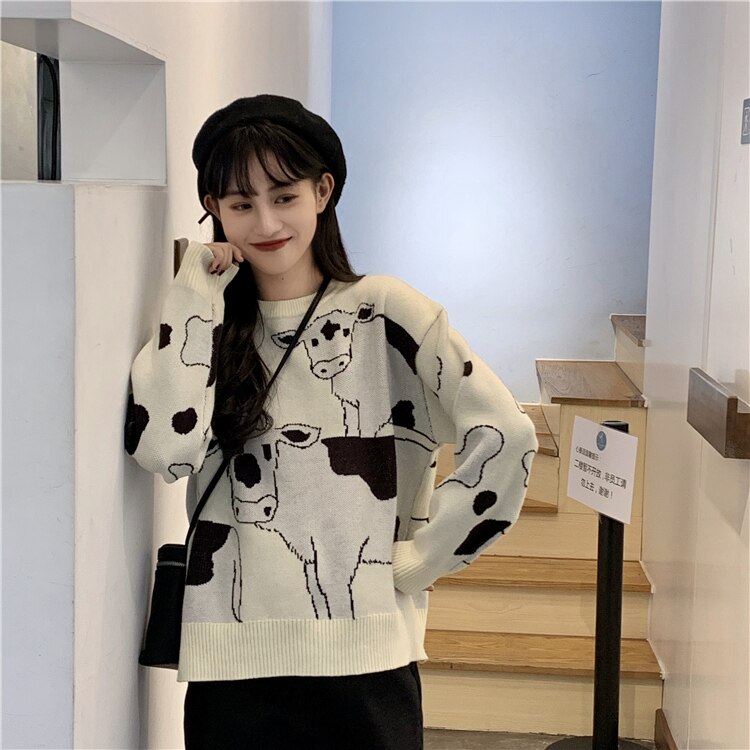 Si te gustan las vacas, este jersey coreano es para ti. Representa vacas blancas y negras. Es un jersey muy apreciado por las jóvenes coreanas. La vaca es un animal tierno y sensible que merece estar en nuestros jerséis. Luce con orgullo vacas en tu jersey de moda.