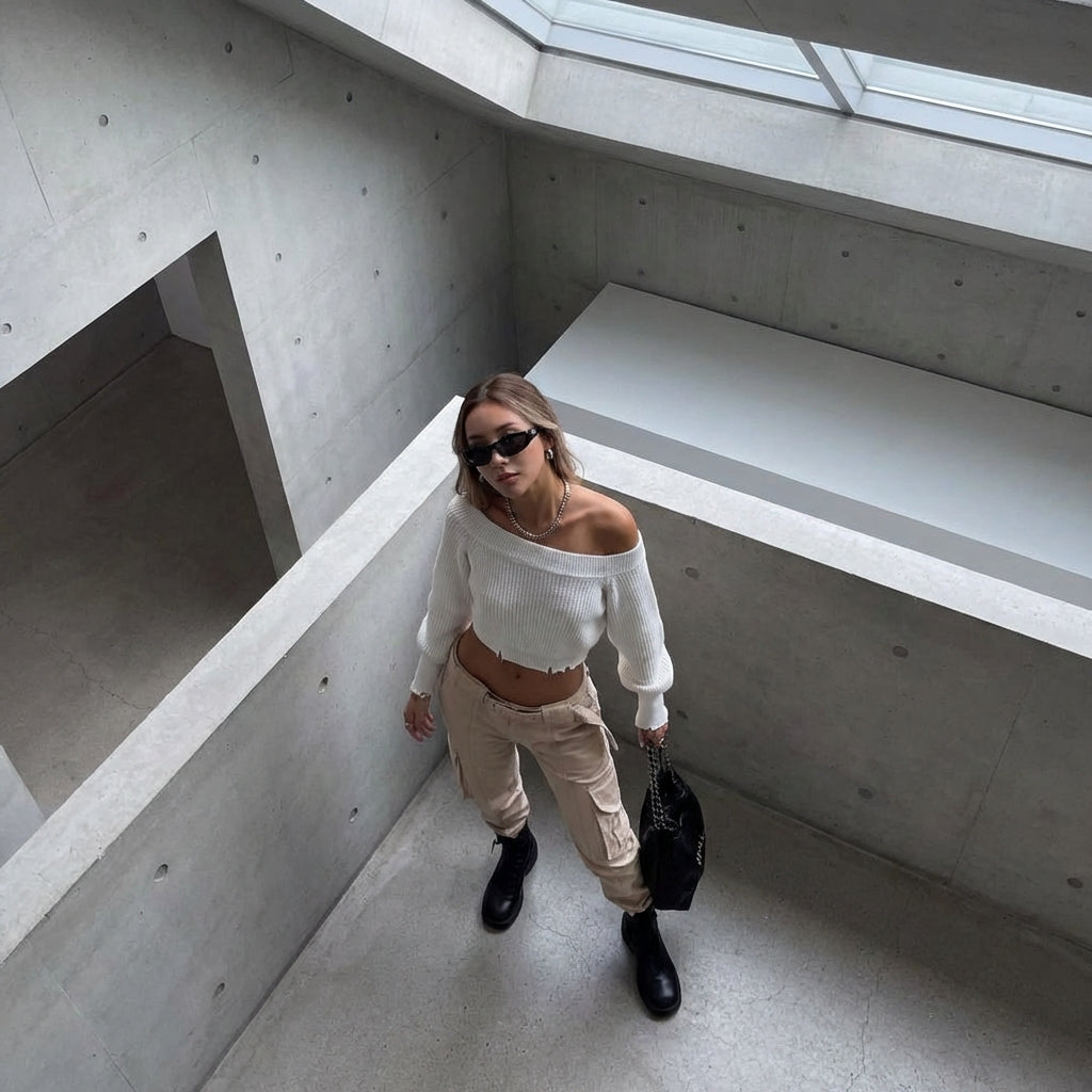Afirma tu estilo con este top de punto de moda, con hombros descubiertos para un toque de sensualidad discreta. Su corte holgado y corto se adapta perfectamente a la silueta, ideal para un look casual o una noche elegante. ¡Un imprescindible para los armarios modernos! ✨