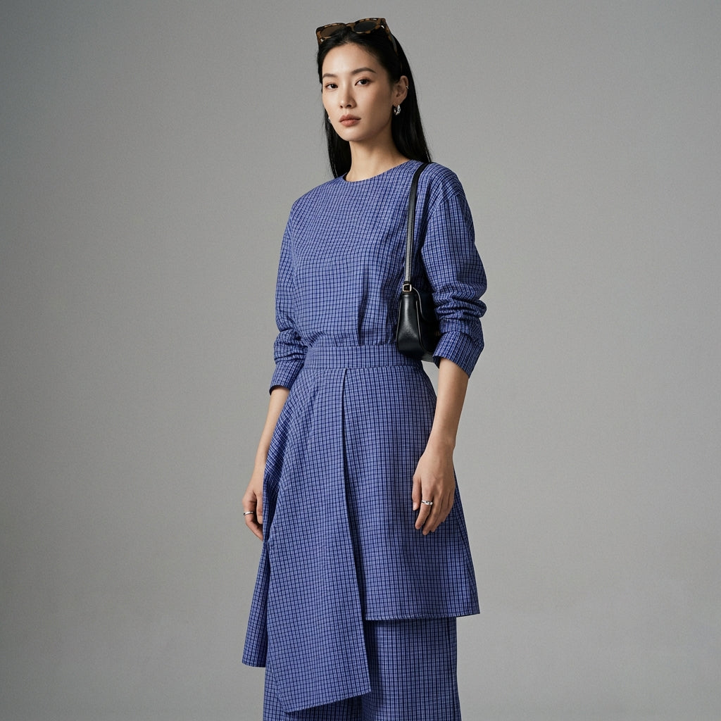 Afirma tu estilo con nuestra falda-pantalón asimétrica de cuadros azules, una pieza única que combina la elegancia de una falda y la comodidad de un pantalón. ¡Su corte innovador y su diseño de "falsa" falda te garantizan un look moderno y estilizado! 💙