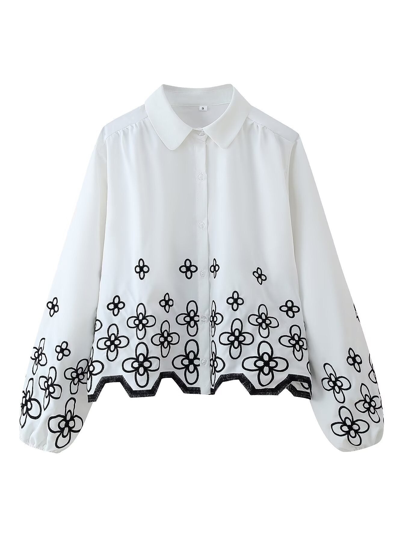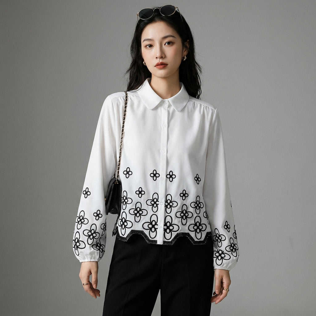 Adopta un estilo sofisticado y moderno con nuestra camisa de manga larga, que presenta un elegante cuello doblado y delicados bordados. ¡Perfecta para realzar cualquier atuendo, encarna la elegancia informal! ✨