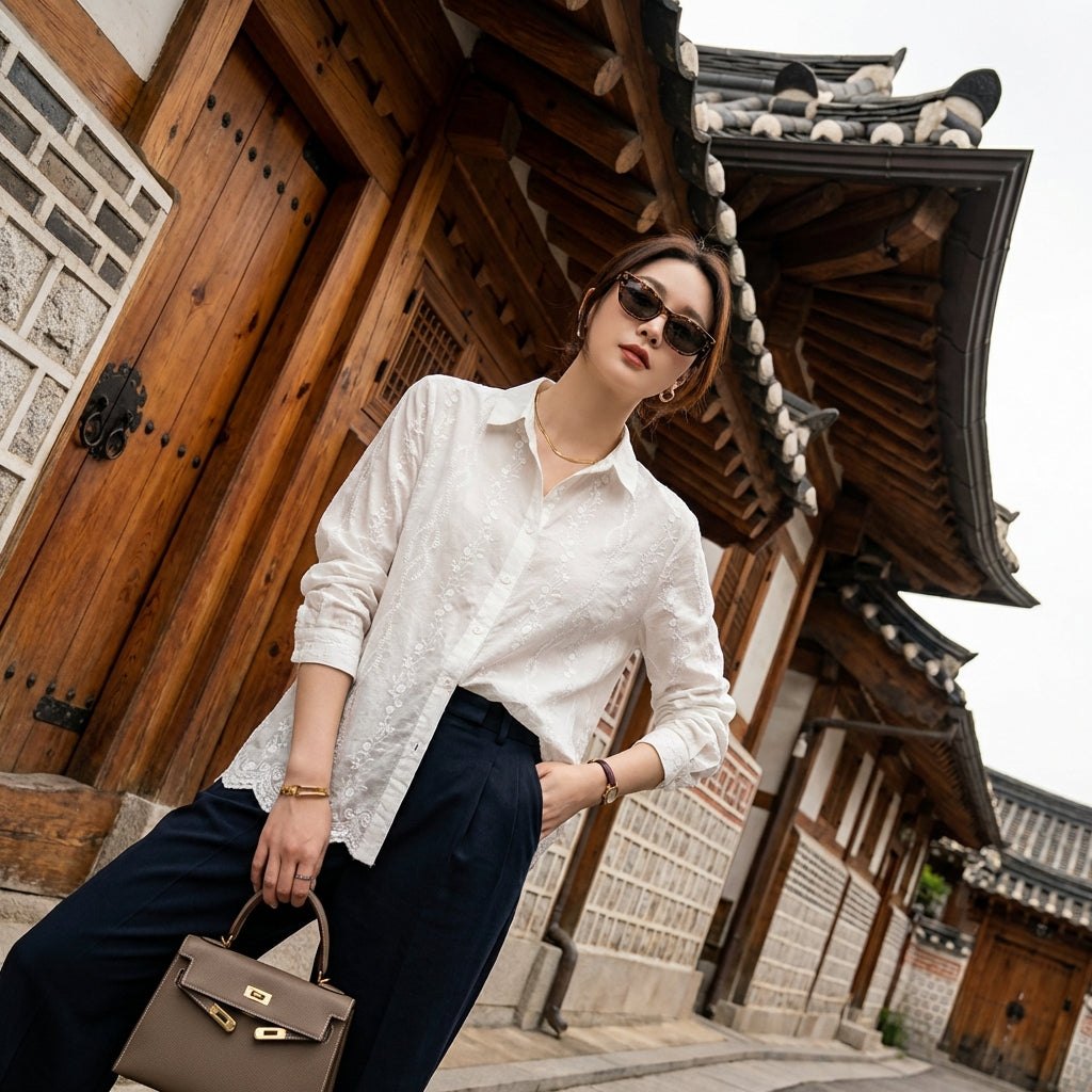 Con sus acabados cuidados y su diseño depurado, esta camisa es un imprescindible para un guardarropa elegante y moderno, reflejando lo mejor de la K-fashion.