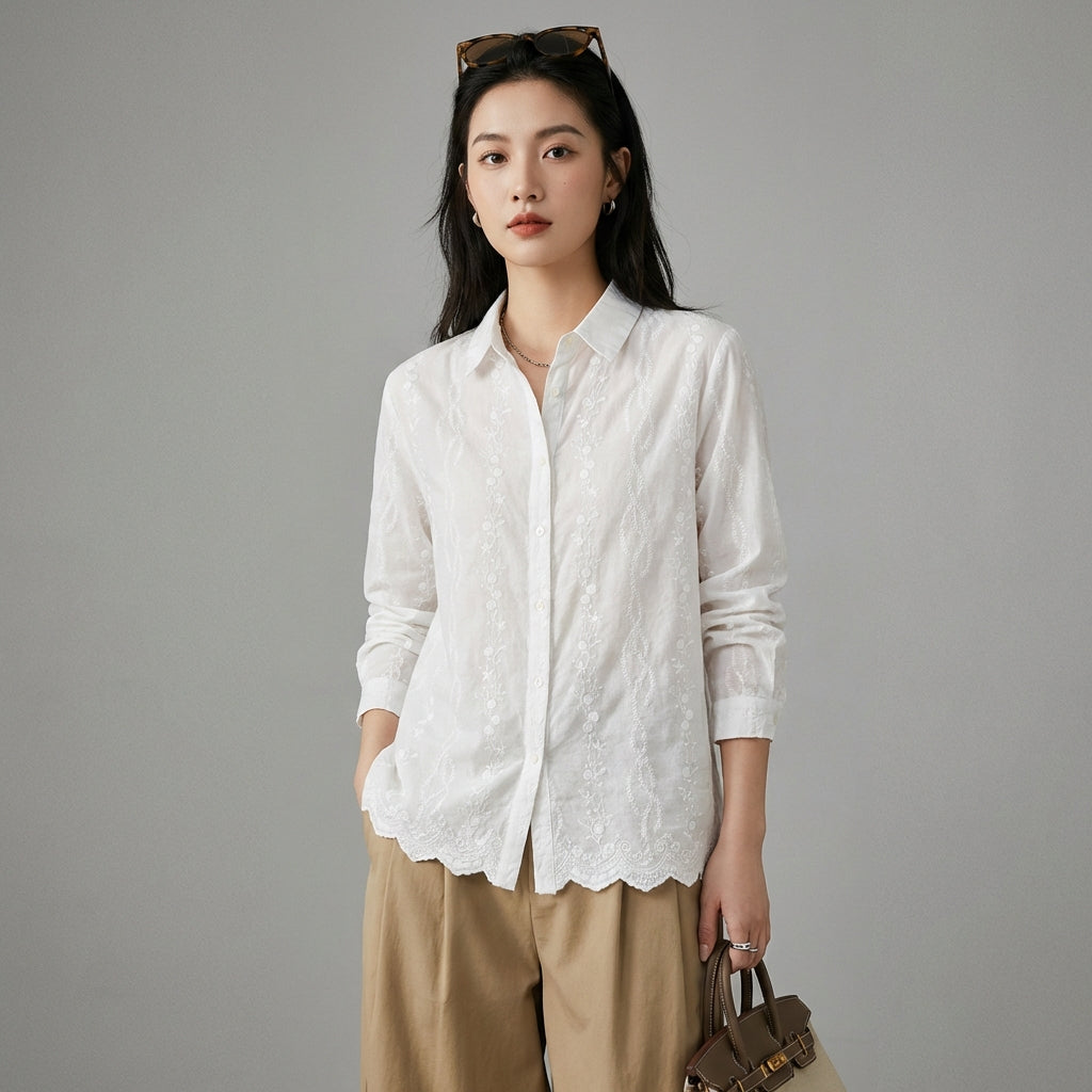 Chemise femme brodée florale, col pointu - Koreanxwear
