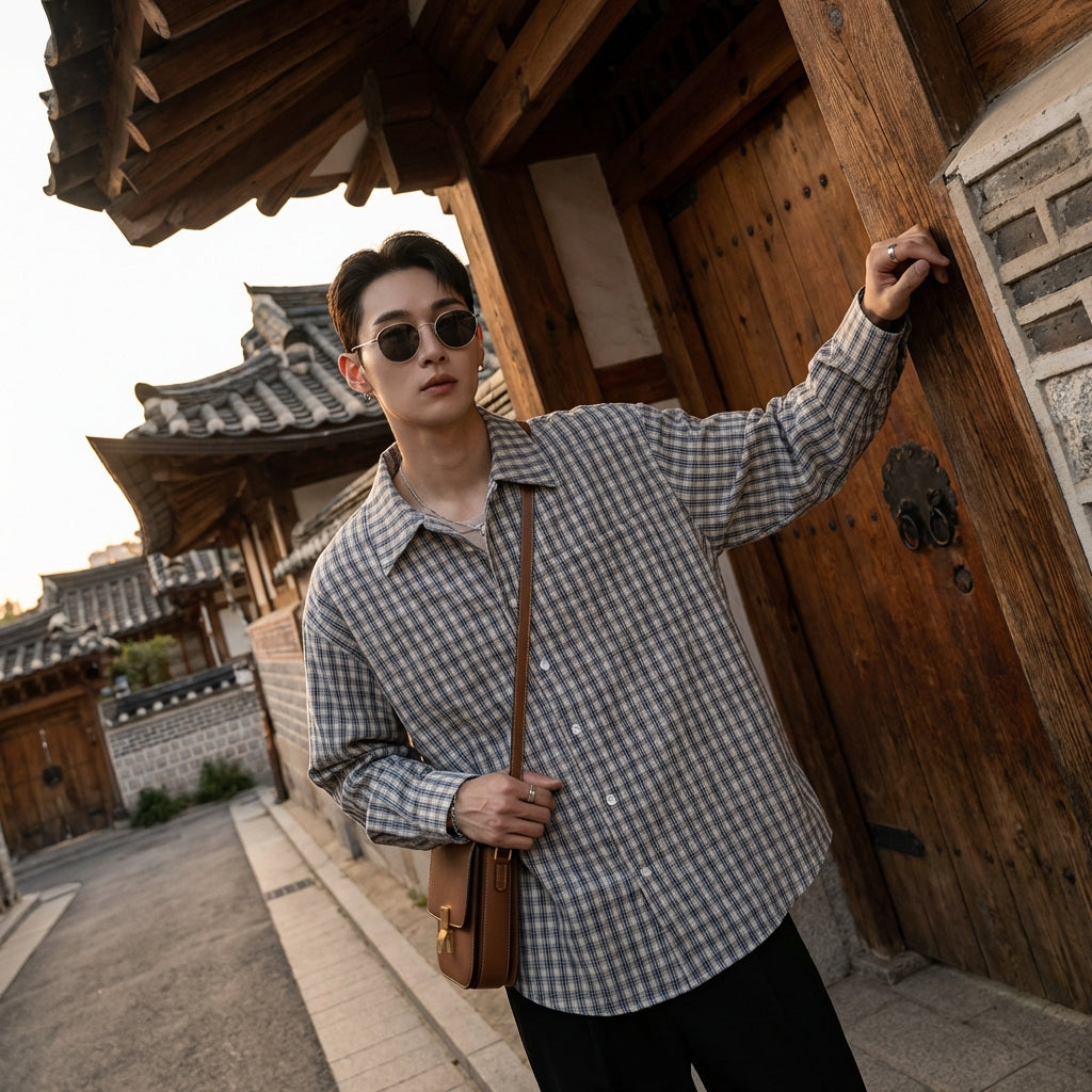 - Estilo: Streetwear, Casual, K-fashion. Su estampado de cuadros atemporal y su corte holgado la convierten en un imprescindible del estilo urbano y de la moda coreana casual.