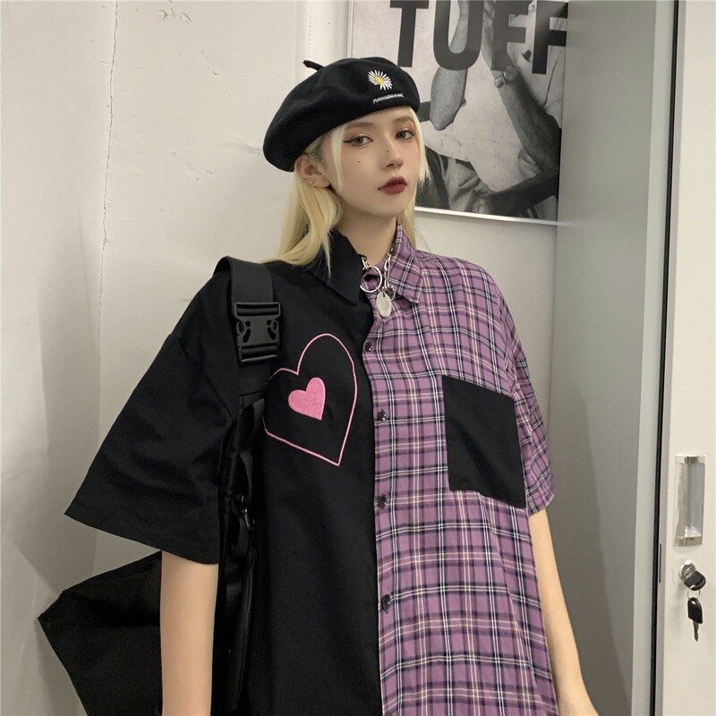 Aquí tienes una camisa Ulzzang con un lado negro y un lado a cuadros. Es una camisa que representa el amor, ya que tiene un corazón bordado. Esta hermosa camisa tiene un look único.