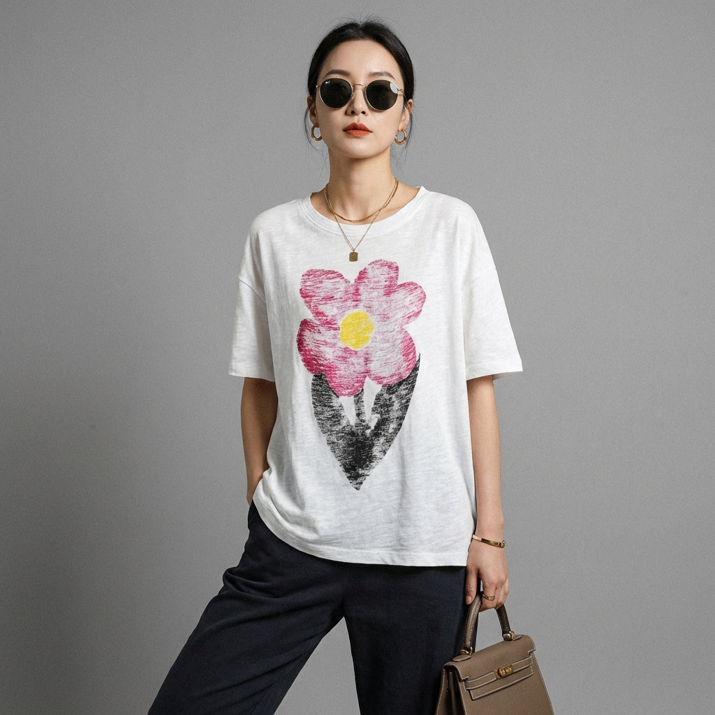 Adopta un look casual y con estilo con nuestra camiseta holgada con estampado floral. Diseñada para la comodidad y la versatilidad, esta camiseta de cuello redondo es perfecta para cualquier ocasión, ¡aportando un toque de frescura a tu armario de verano! 🌸