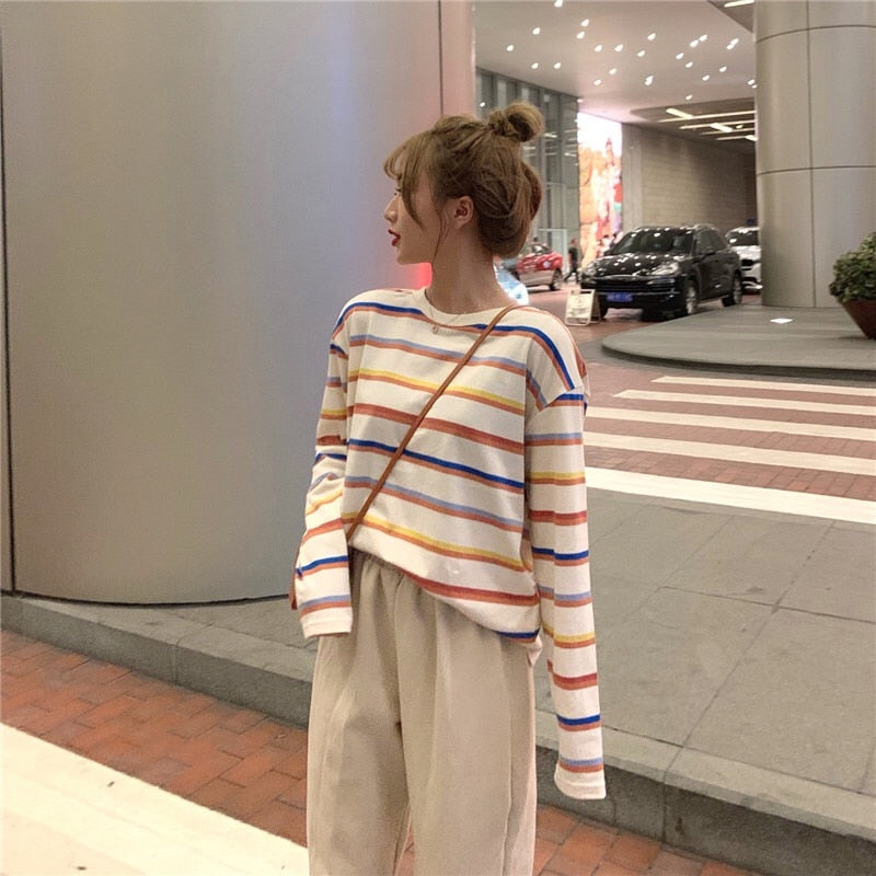 ¡Una camiseta para mujer con rayas anchas y coloridas para darle un toque de alegría a tu atuendo K-Pop!