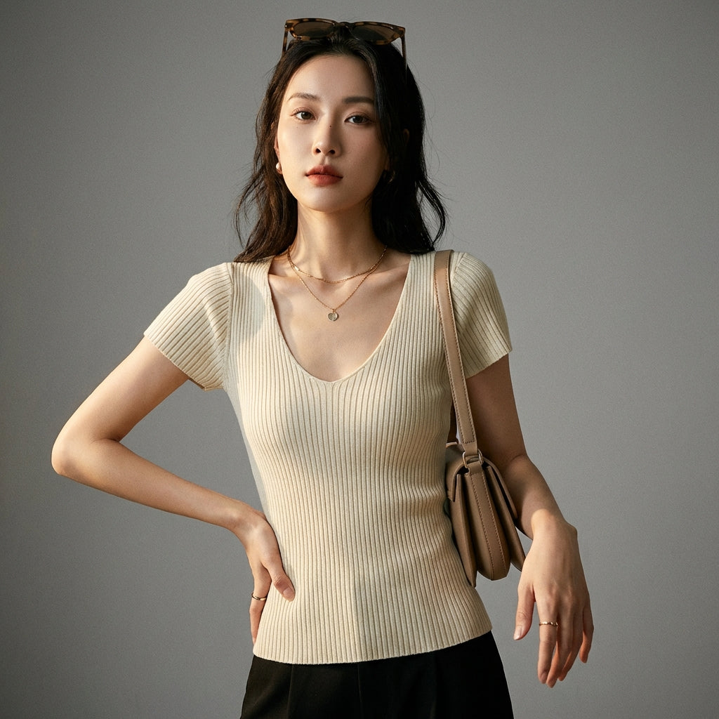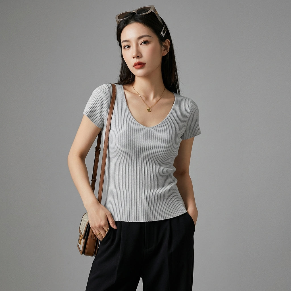 Adopta un look minimalista y moderno con esta camiseta corta de punto con cuello en V. Su corte ajustado y su diseño depurado la convierten en un básico para una silueta moderna y elegante. ¡Perfecta para los días soleados o para combinar con otras prendas! ✨