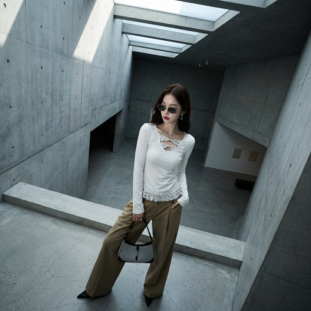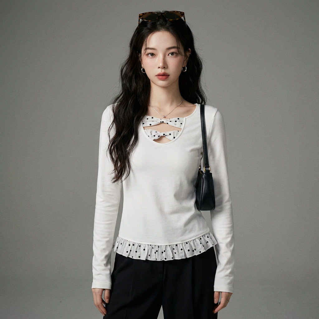 Adopta un look fresco y suave con nuestra camiseta de cuello en U de manga larga, adornada con delicados lunares. ¡Su corte slim fit y su longitud cropped la convierten en una elección perfecta para realzar tu figura con elegancia y modernidad! 🌸
