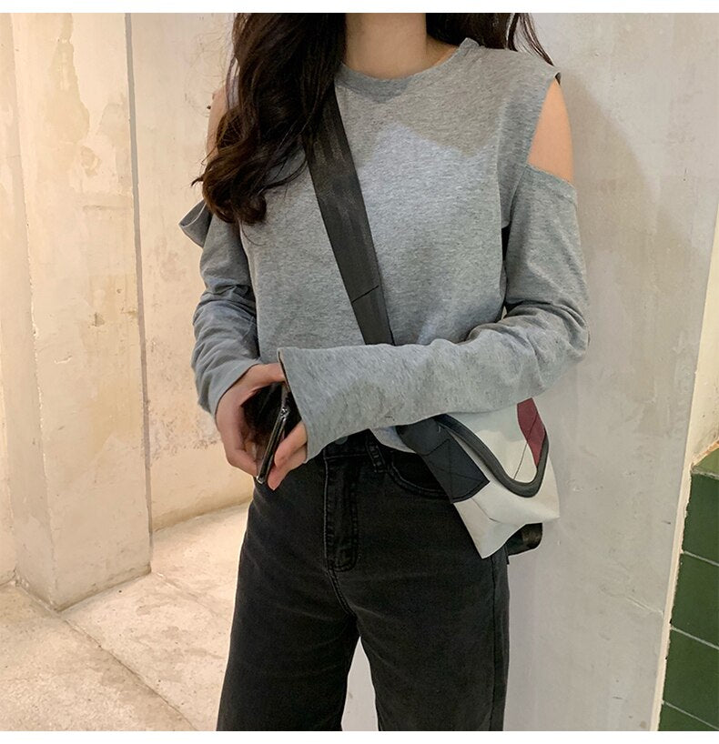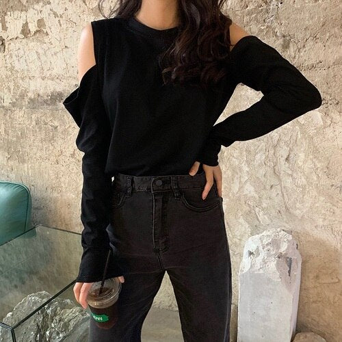 Lleva este bonito T-Shirt con aberturas en los hombros. Es un top muy de moda en Corea del Sur. Resalta tu lado femenino y tiene mangas largas.