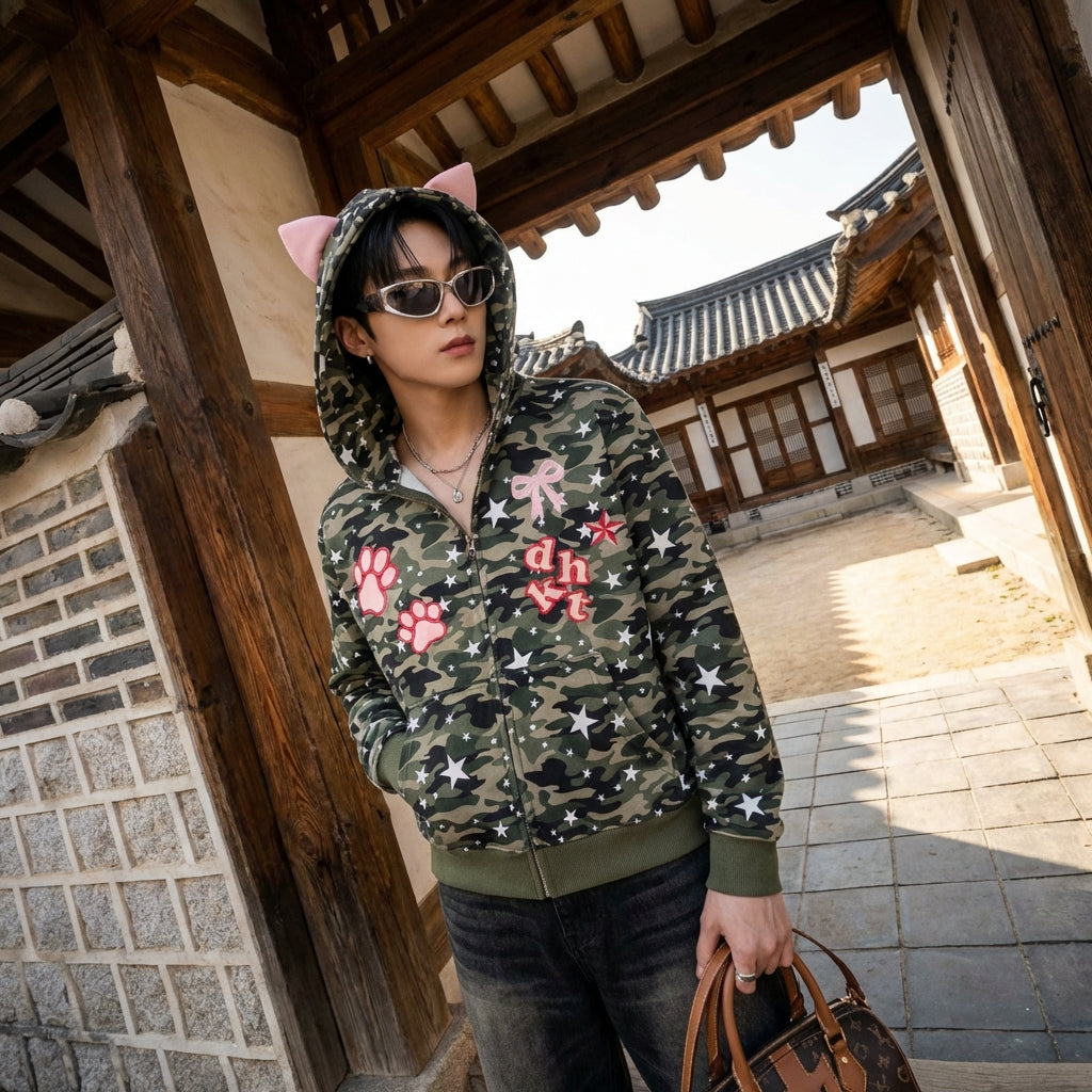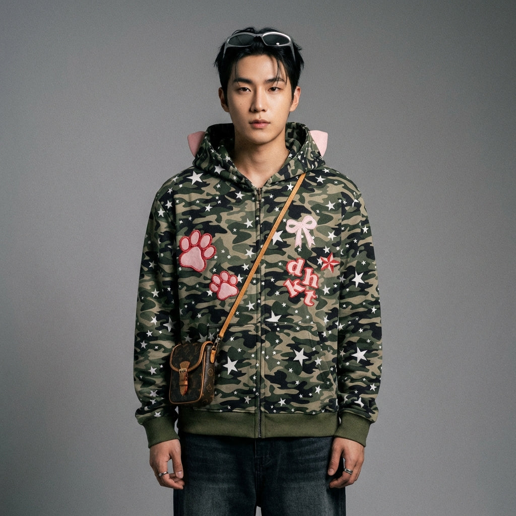 Adopta un look atrevido y casual con nuestro cárdigan con capucha unisex, con un estampado de camuflaje integral y bordados de huellas de estrellas. ¡Su corte holgado garantiza una comodidad óptima y un estilo streetwear afirmado! ✨