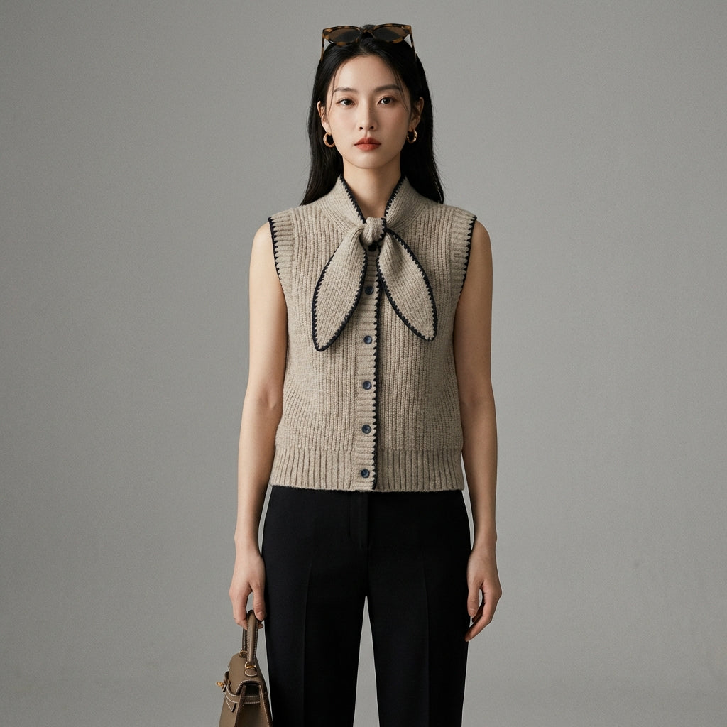 Adopta un look chic y refinado con nuestro chaleco de botonadura sencilla, realzado con un delicado lazo y bordes contrastantes. ¡Su cuello alto y su corte impecable lo convierten en una pieza clave para cualquier guardarropa sofisticado! ✨